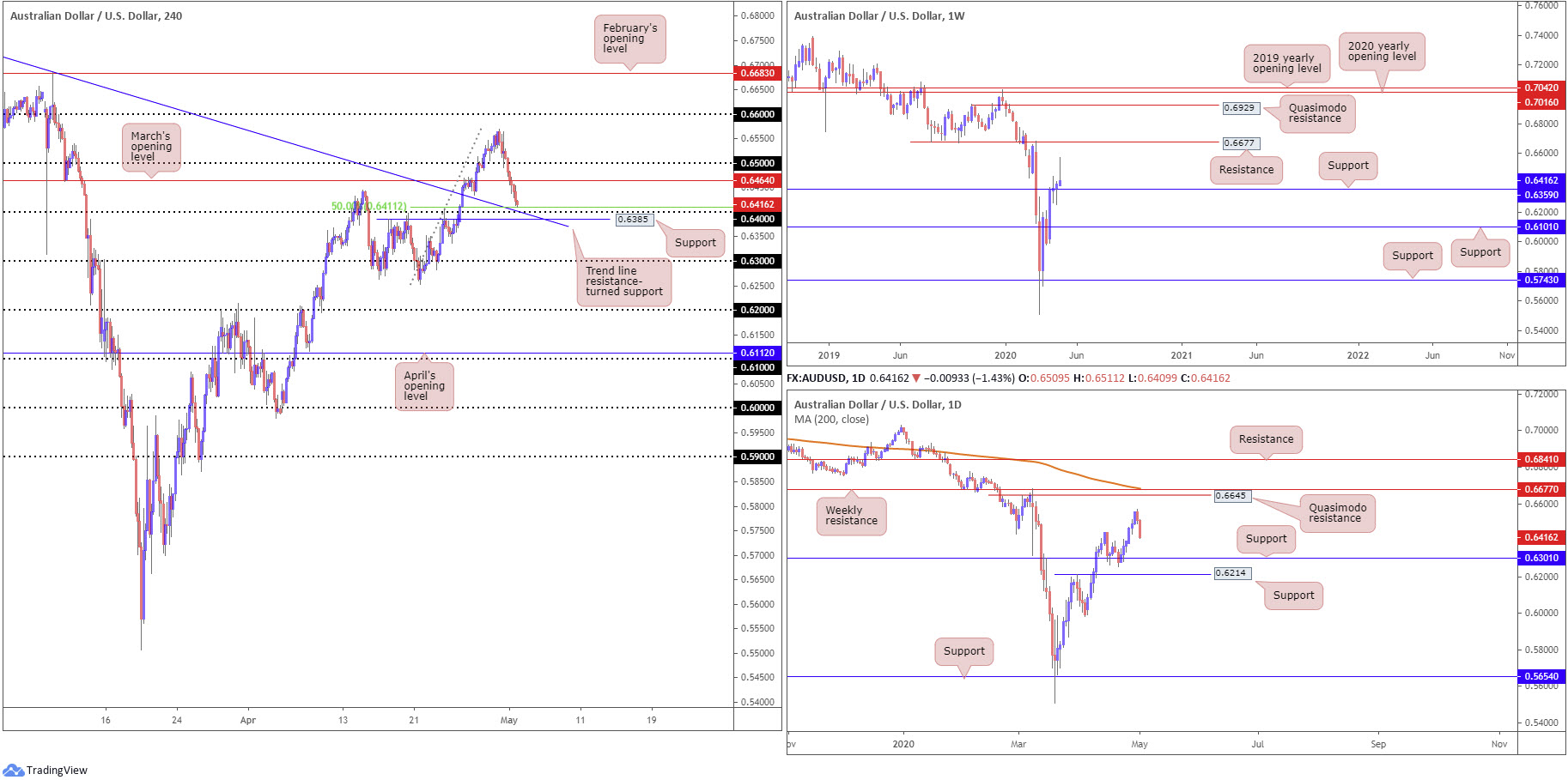 While 0.64 boasts limited confluence from the higher timeframes, the H4 confluence (see above in bold) may be enough to prompt a rebound from this region this week. Prudent traders, however, may feel the need to wait for additional confirmation to form before taking action; whipsaws through round numbers are common viewing.