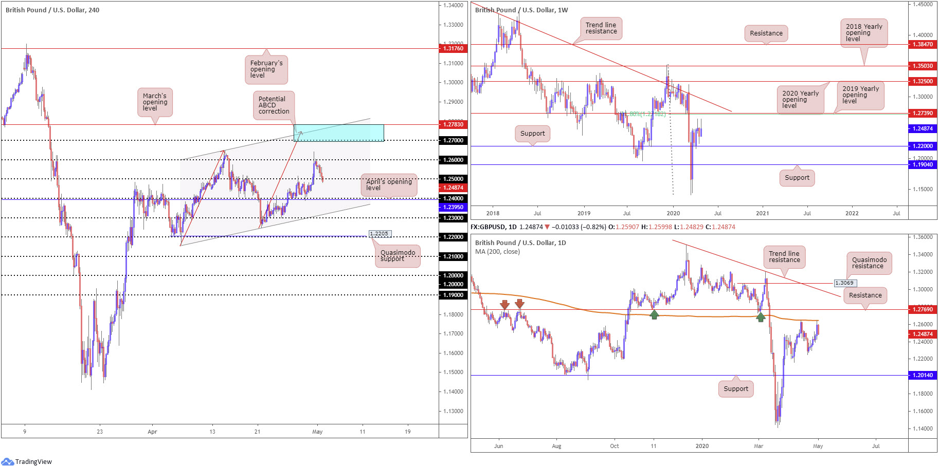 The 200-day SMA (orange – 1.2644) remains a dominant fixture on the daily timeframe, providing resistance on two occasions in April. Friday, as evident from the chart, finished in the shape of a bearish inside day, snapping a two-day bullish phase and underlining the 1.2247 April 21 low as possible support this week. Directly north of the SMA value, traders may also want to acknowledge notable resistance coming in from 1.2769.