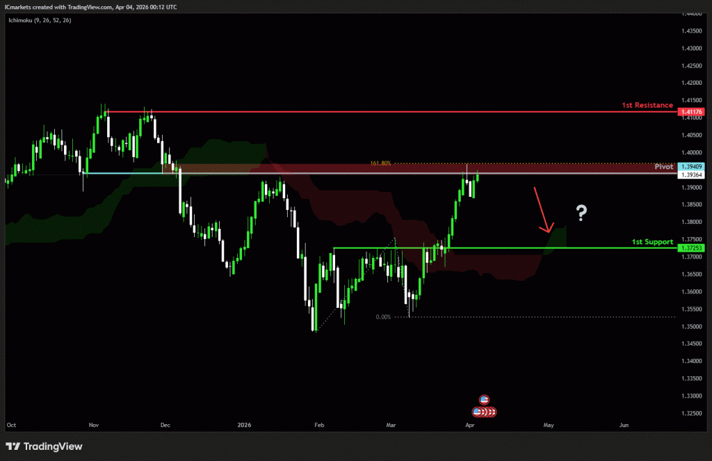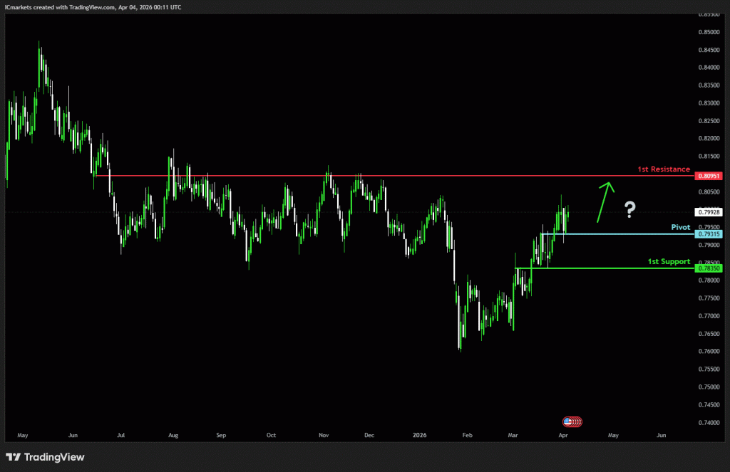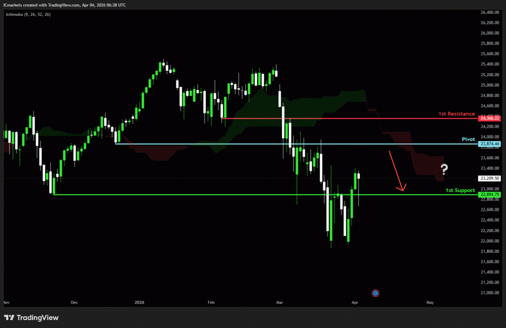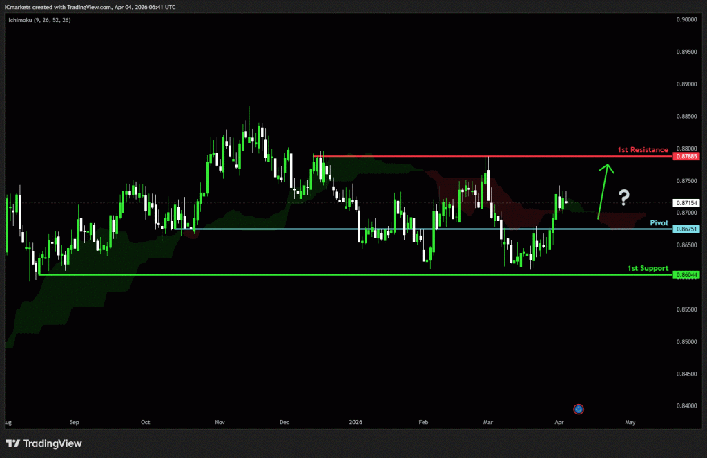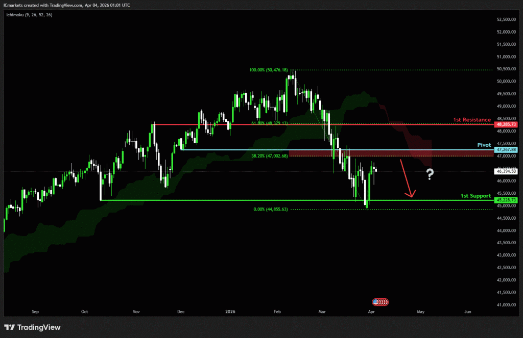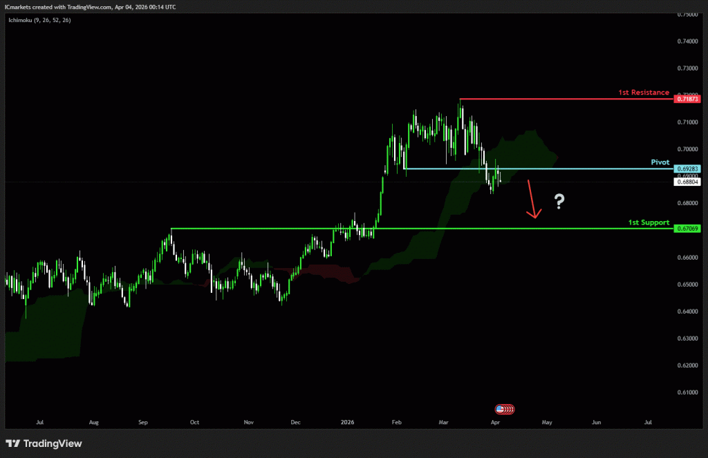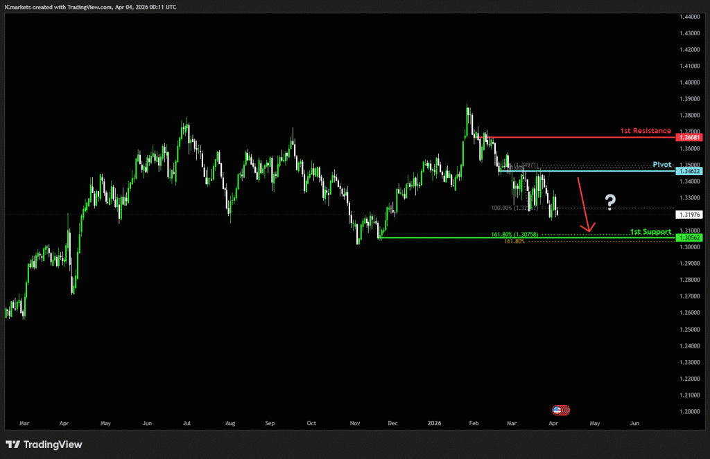 The price could see a short-term pullback toward the pivot before continuing its bearish move down toward the 1st support.