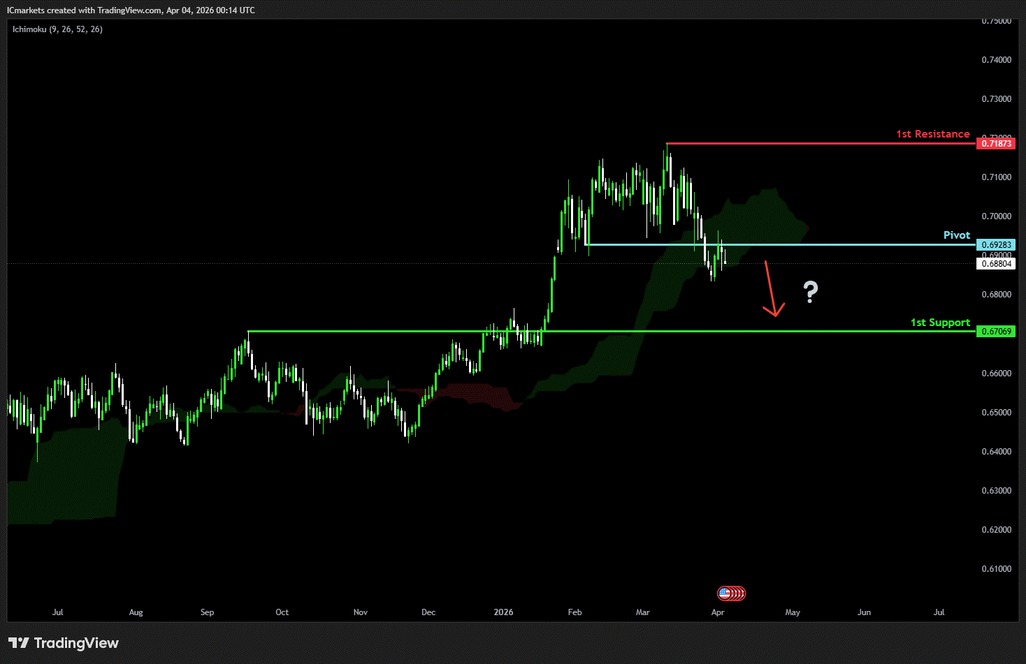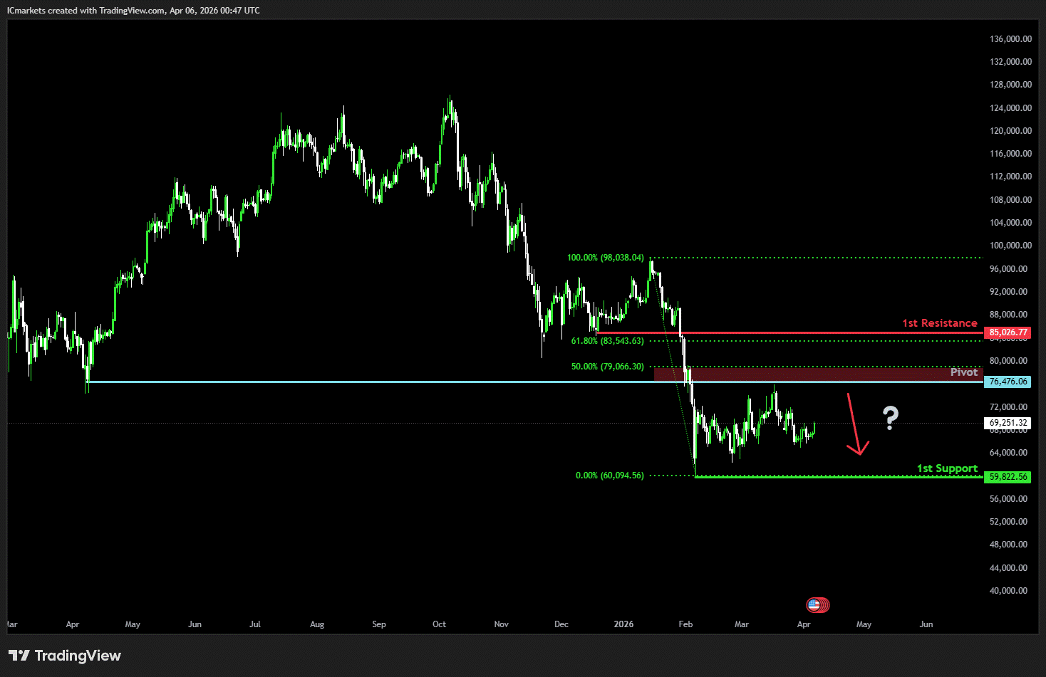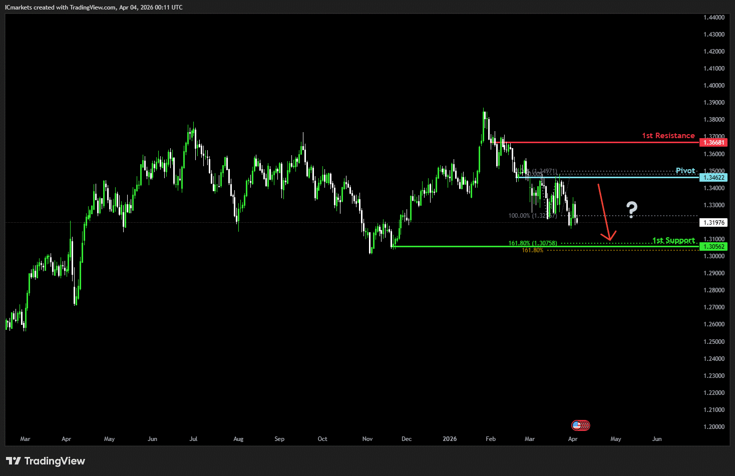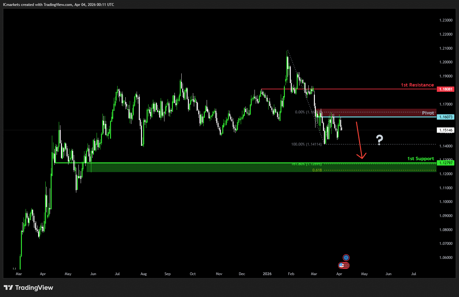 The price could see a short-term pullback toward the pivot before continuing its bearish move down toward the 1st support.