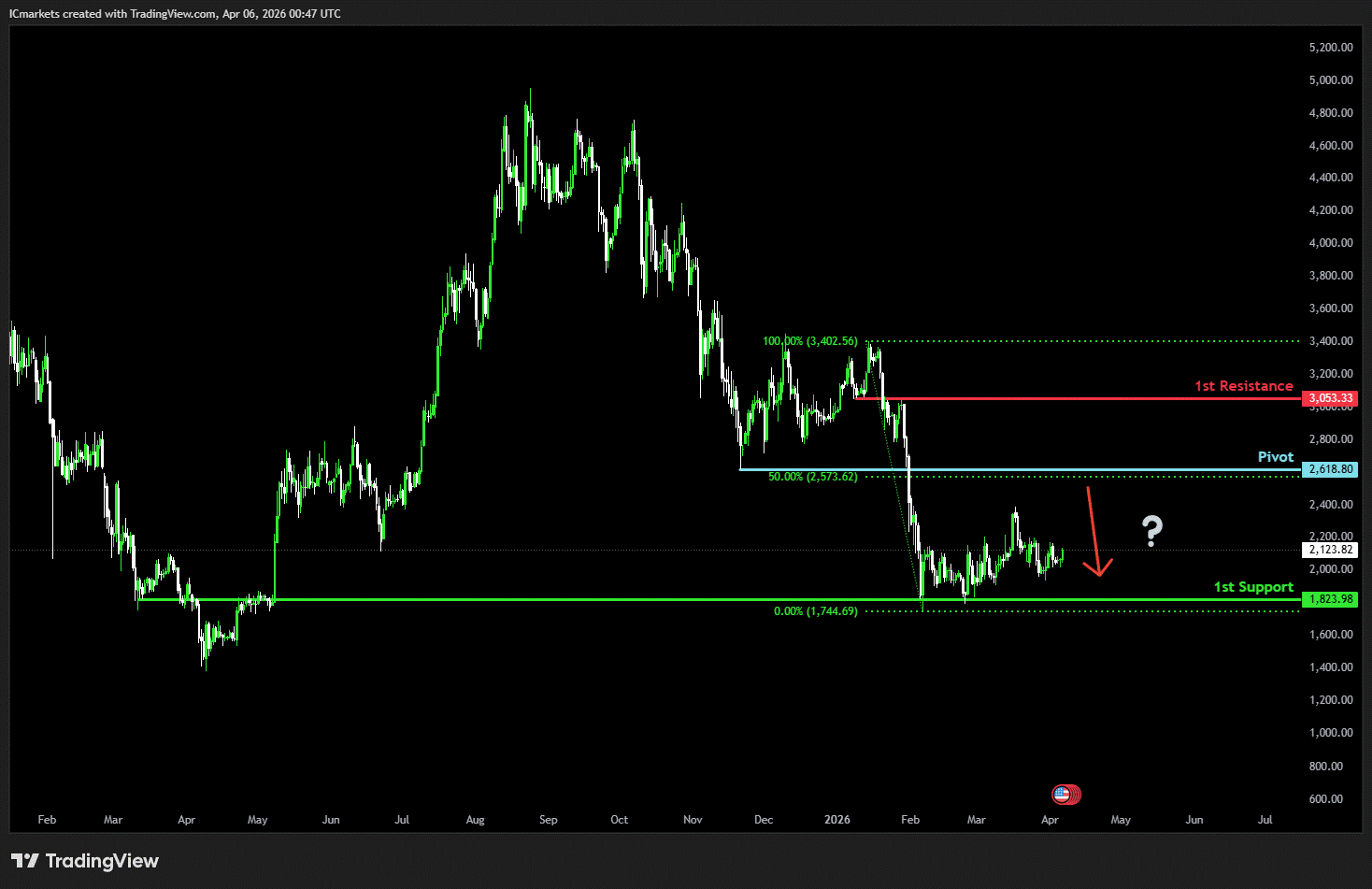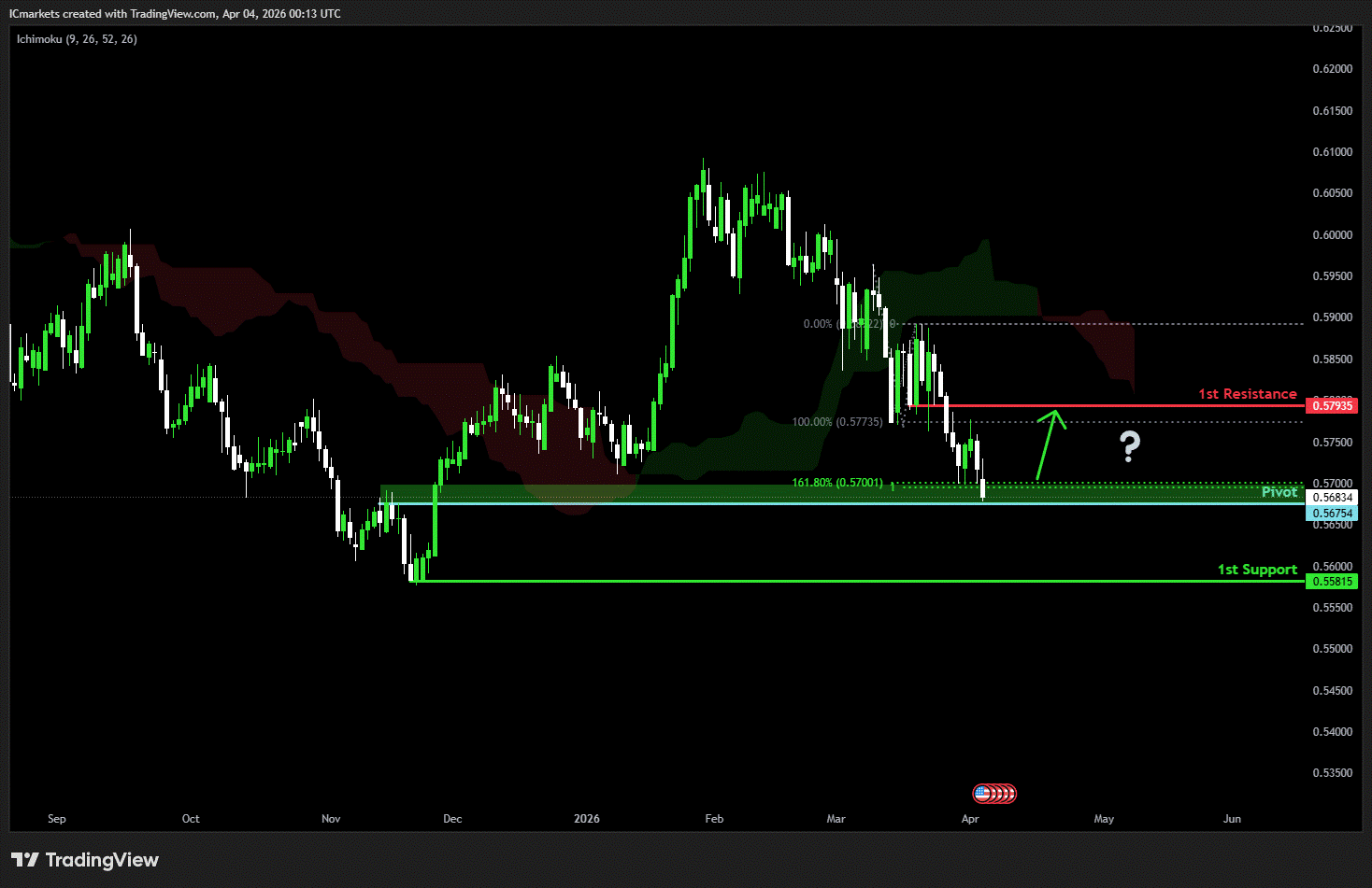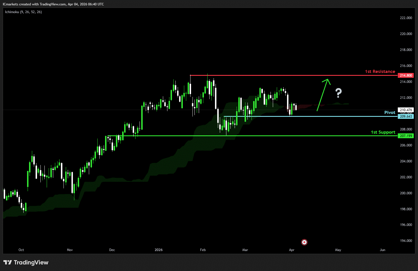 The price could see a short-term pullback toward the pivot before continuing its bearish move down toward the 1st support.