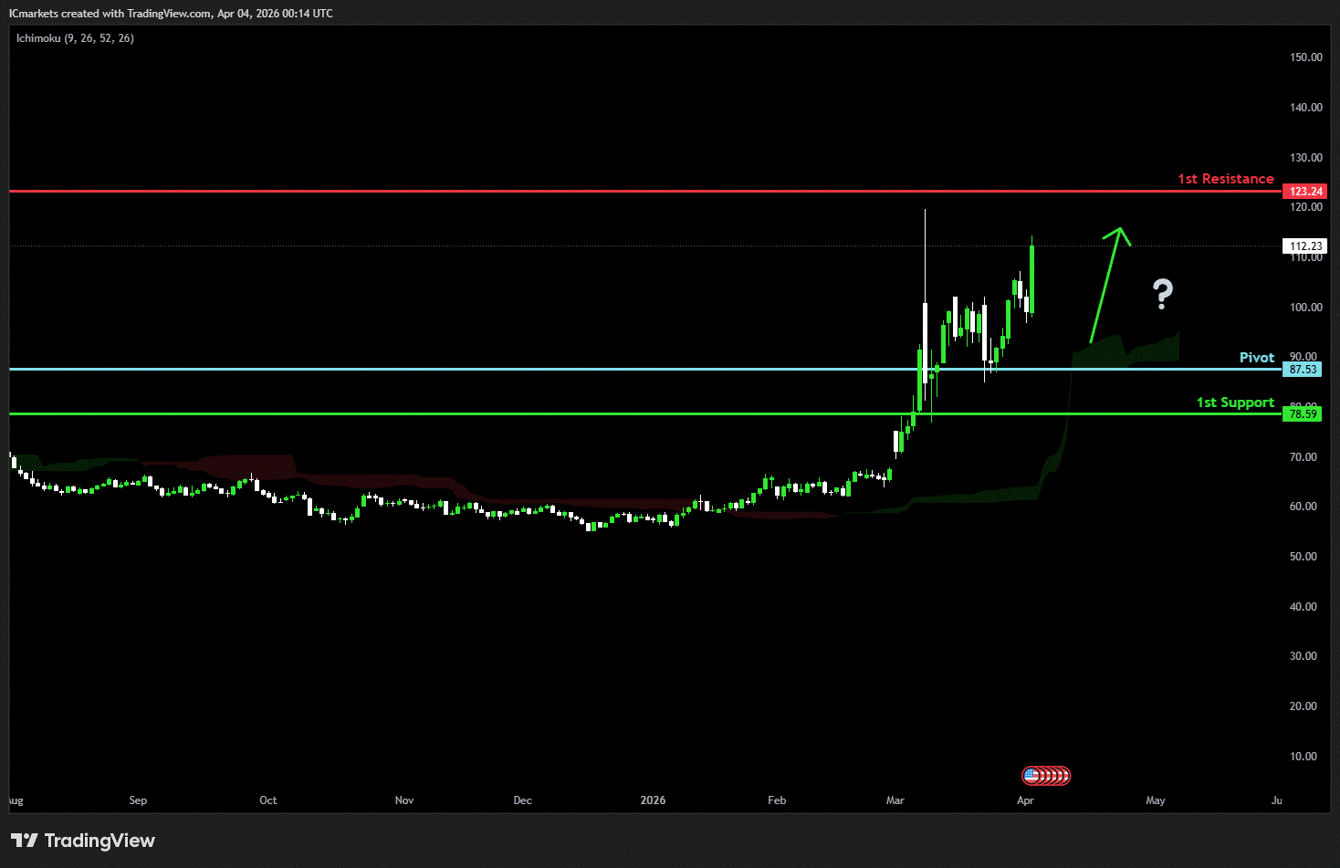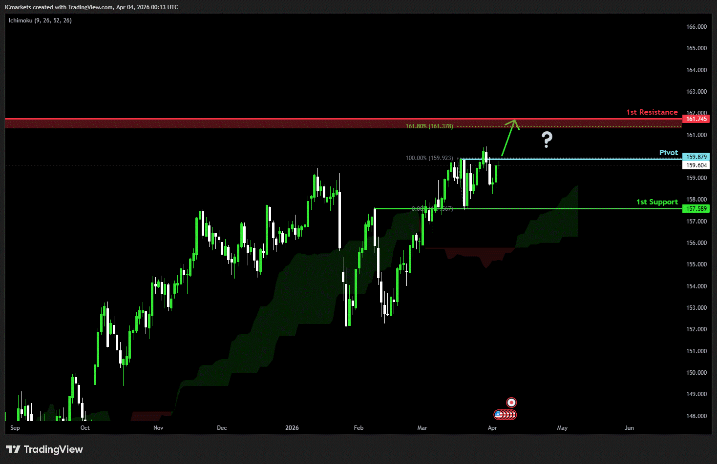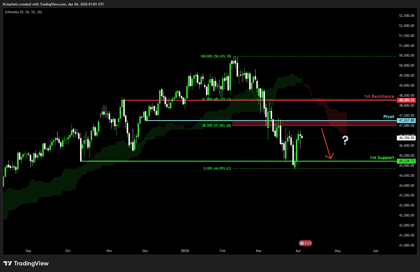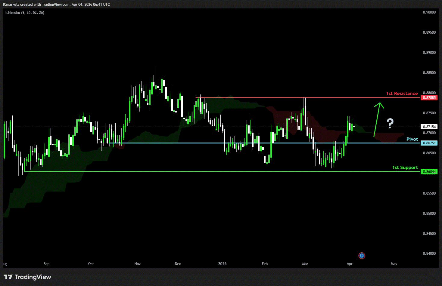 The price could see a short-term pullback toward the pivot before continuing its bearish move down toward the 1st support.