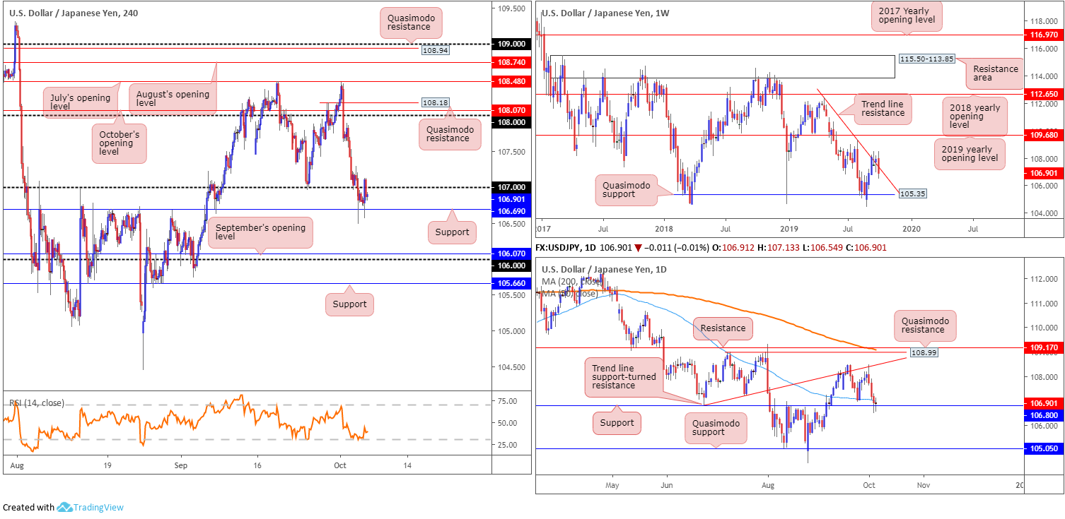 In order to confirm seller intent from the weekly outside candle formation, a daily close below daily support at 106.80 would be a good start. A H4 close beneath H4 support at 106.69, though, would be even better, likely clearing the pathway to the 106 region. Entry (sell)/stops set on the back of the breakout candle is an idea; others, nevertheless, may prefer to witness a retest at 106.69 and set entry/stop levels based on the rejection candle’s framework.