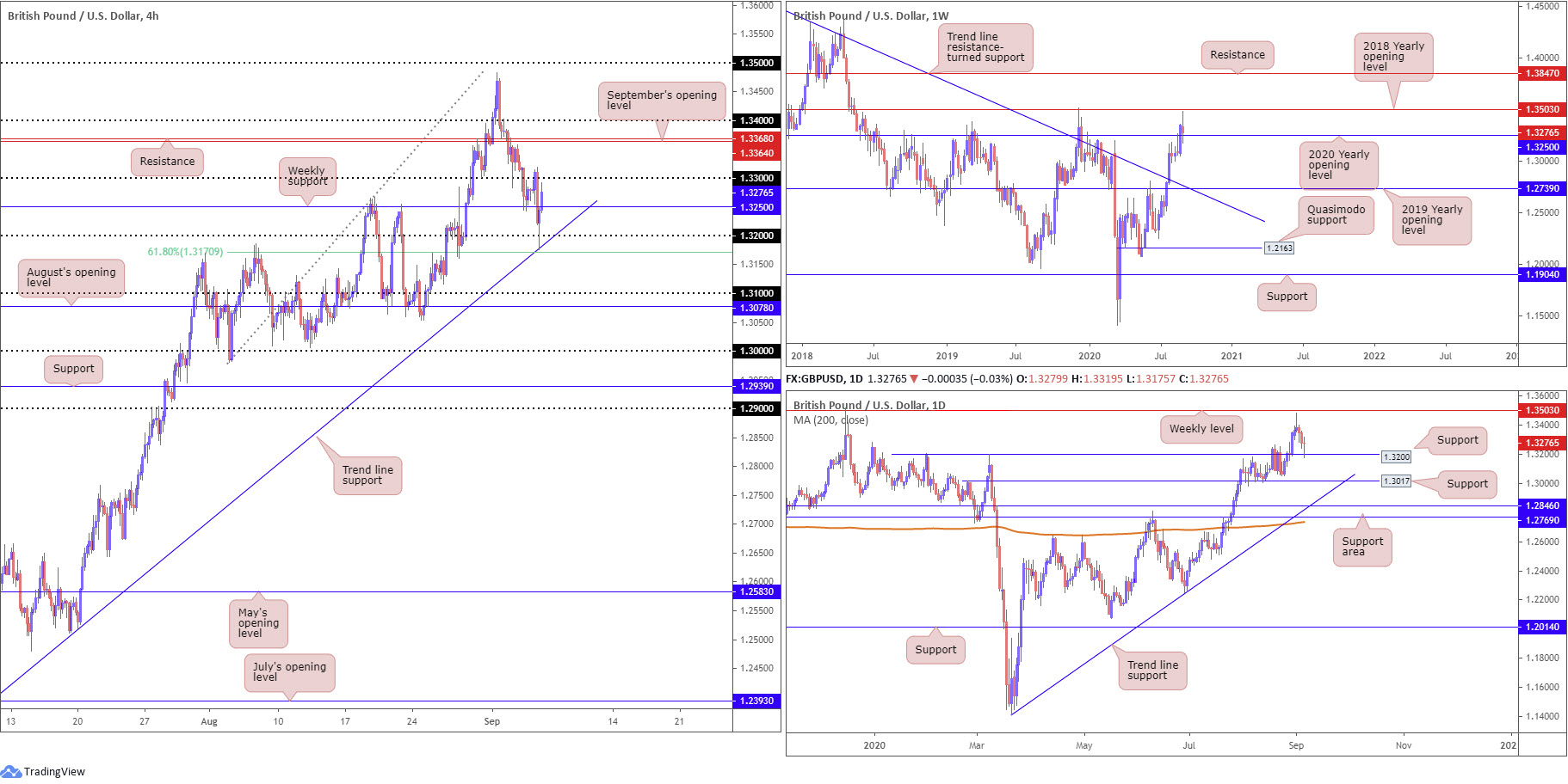 Gliding to an eighth consecutive losing week in recent trading, price action, after securing ground under the 2017 yearly opening level at 1.3434 and trend line support (taken from the low 1.2061), crossed swords with support at 1.3059, a level positioned just north of the 2020 yearly opening level at 1.2975.