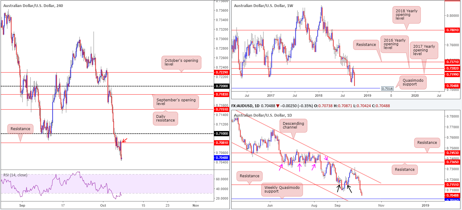 Seeing as both weekly and daily charts indicate further downside this week, Friday’s strong H4 bearish engulfing formation (red arrow) printed off H4 resistance at 0.7081 is likely enough to draw in sellers and push towards 0.7016: the weekly Quasimodo support level.