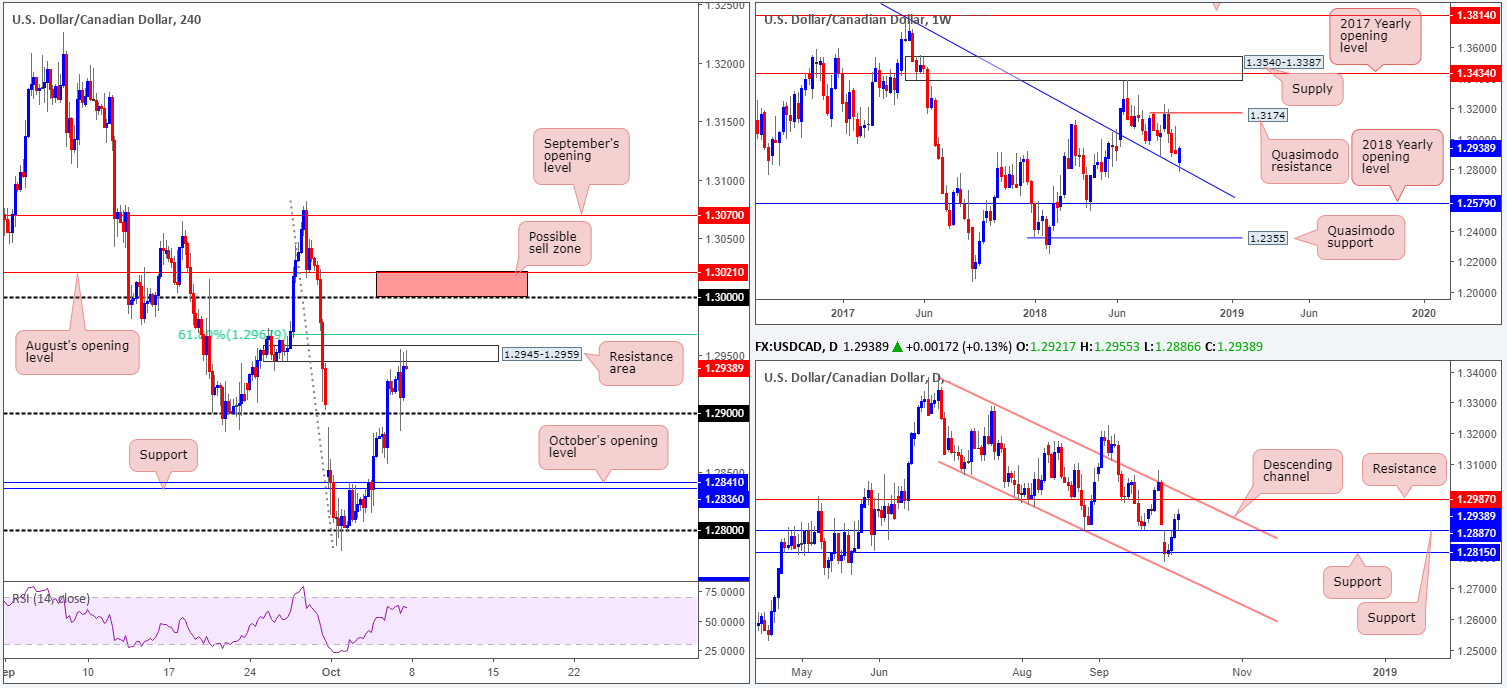 Side-by-side Canadian and US employment reports produced a violent M30 indecision candle on Friday, though managed to remain bid above its 1.29 handle. The session wrapped up with H4 price testing a nearby resistance area at 1.2945-1.2959 (sited just south of a 61.8% Fib resistance at 1.2967) in the shape of a bearish pin-bar formation. A break beyond these areas may call for a move towards the key figure 1.30, though do bear in mind before reaching this neighborhood, daily resistance at 1.2987 and its converging channel resistance will have to be tackled beforehand.
