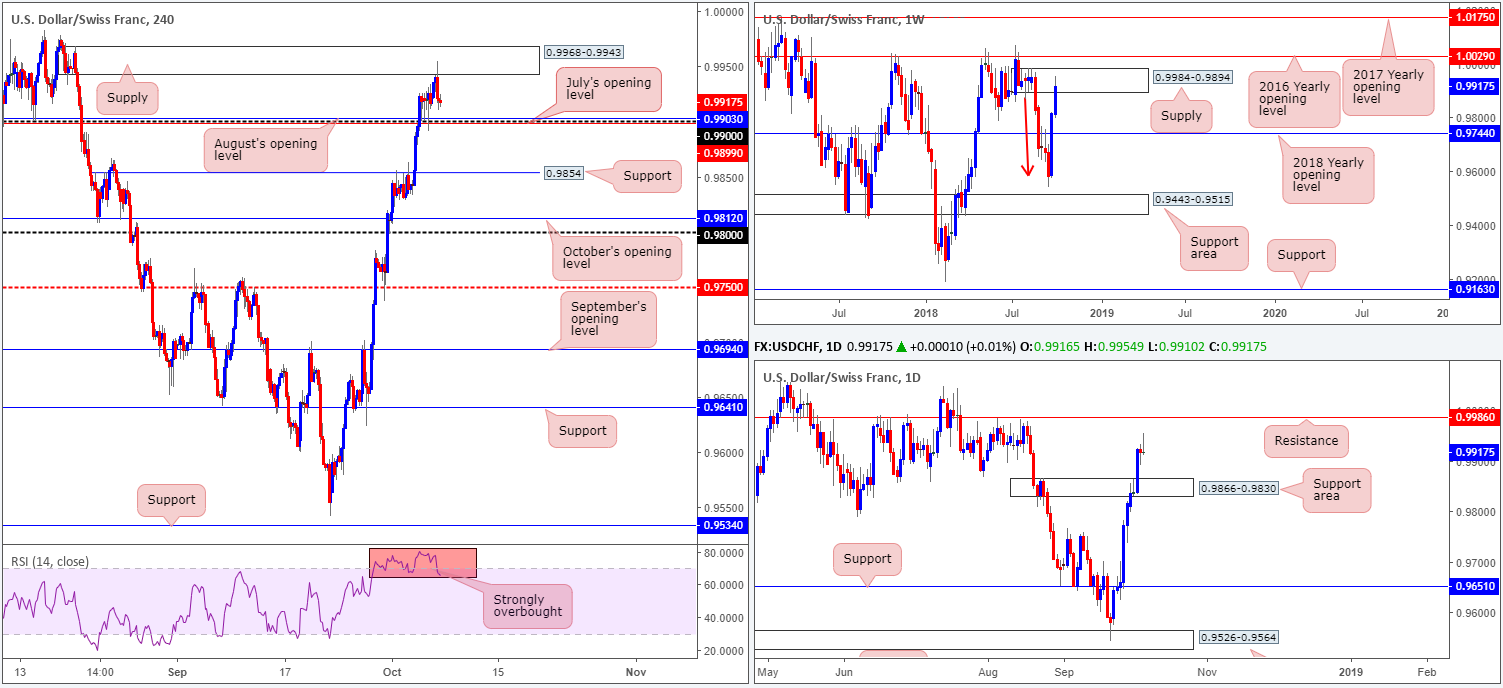 After successfully overthrowing its 2018 yearly opening level at 0.9744, USD/CHF bulls went on the offensive for a second consecutive week and brought the unit strongly into supply territory at 0.9984-0.9894. Although In terms of structure this area boasts solid momentum out of its base (red arrow), traders may want to pencil in the 2016 yearly opening level at 1.0029 in the event we push for higher ground this week.