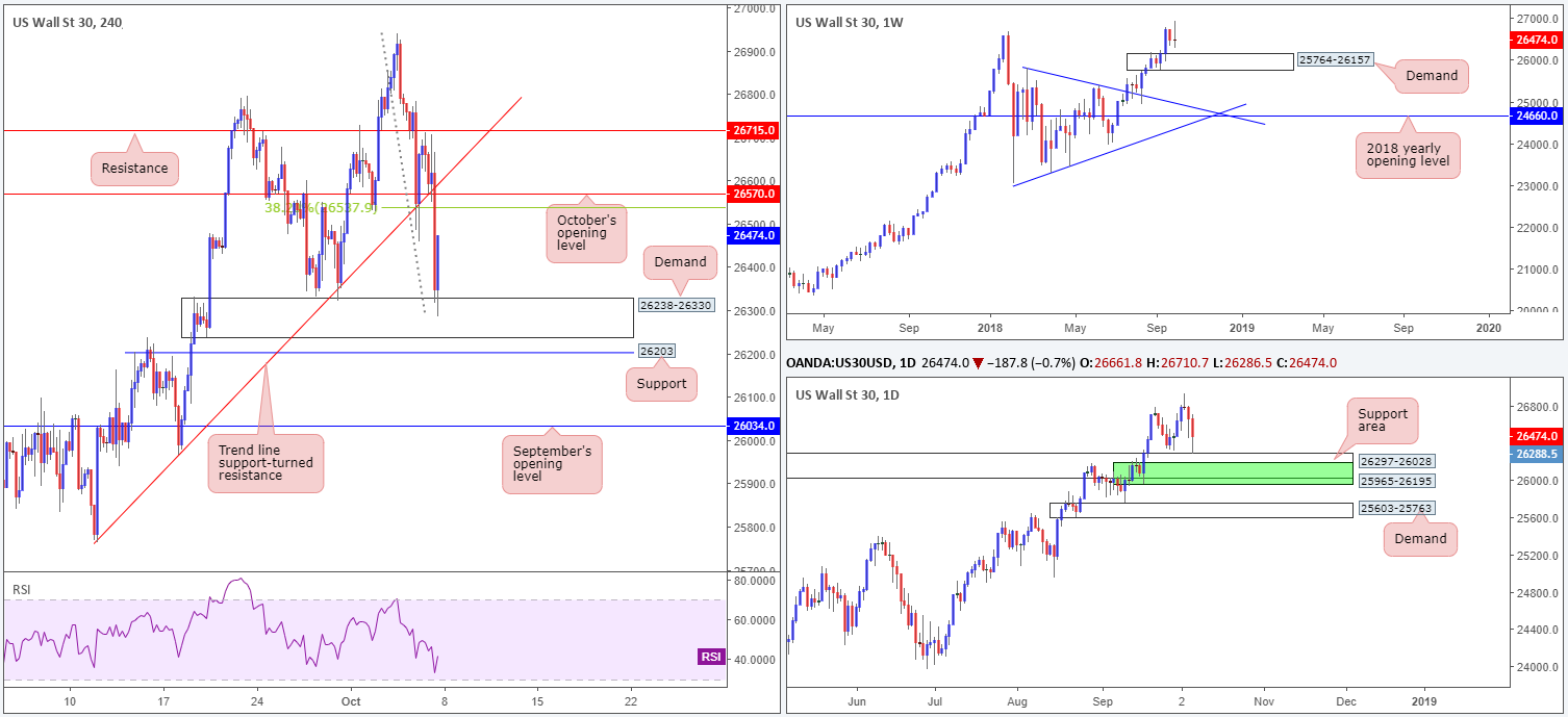 Friday’s US employment report failed to support price action. Weighed on heavily by a waning tech sector, the candles aggressively broke through October’s opening level at 26570 and tested demand at 26238-26330. Likely helped by the fact this area is seen glued to the top edge of the daily support area mentioned above at 26297-26028, this base held its ground and closed at highs of 26474.