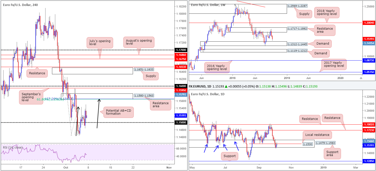 Friday’s non-farm payrolls rose 134k in September, below the expected 185k. Average hourly earnings came in line at 0.3%, while the unemployment rate fell slightly and came in at 3.7%, a tad below the 3.8% consensus. The aftermath of the US job’s numbers witnessed an immediate decline to lows of 1.1483. However, the move was a short-lived one as price swiftly recovered to highs of 1.1549: the session high for the day.