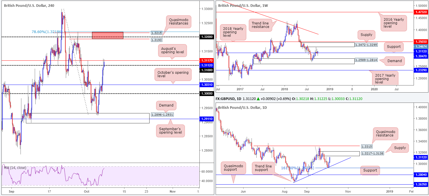 With the above in mind, the red zone on the H4 timeframe at 1.3021/1.30 (comprised of August’s opening level and a round number) is of interest this week. Positioned close by the noted daily resistances, a short from here is a possibility.
