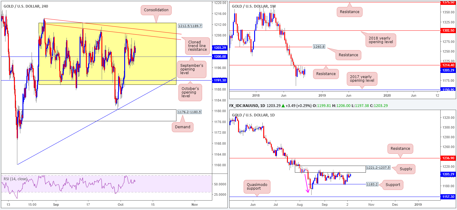 Since the later stages of August, the H4 candles (apart from a brief spell during late September) have been busy carving out quite a substantial consolidation between 1212.5/1189.7. Within this boundary, we can see September’s opening level at 1200.0, October’s opening level at 1191.3, a cloned trend line resistance (taken from the high 1214.3) and trend line support (extended from the low 1160.0).