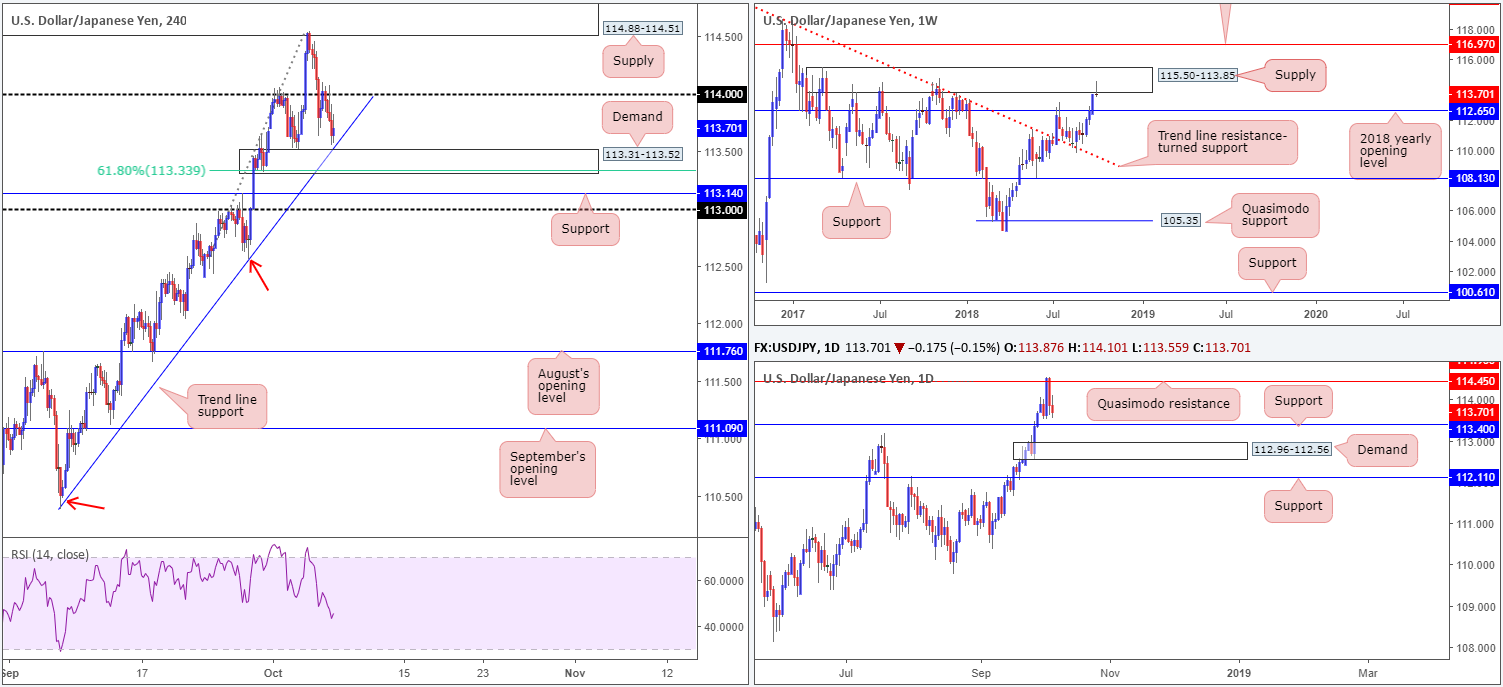 From a technical perspective, the unit is seen trading a stone’s throw away from demand placed at 113.31-113.52. It might be worth noting this area houses the daily support level mentioned above at 113.40, a 61.8% H4 Fib support value at 113.34 and also converges closely with a H4 trend line support (extended from the low 110.38). A violation of this area will force the pair immediately in range to test support at 113.14, shadowed closely by the 113 handle.