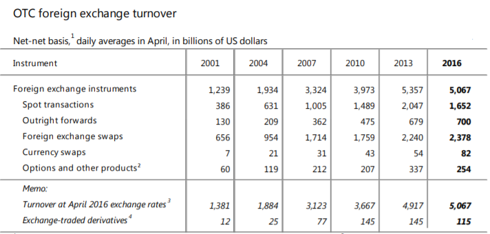 As disclosed in the table below (courtesy of BIS), foreign exchange swap transactions cleared an impressive turnover of more than $2.3 trillion per day in 2016, trailed reasonably close by foreign exchange spot transactions at more than $1.6 trillion per day. Spot market trading activity actually fell by 19% in April 2016. This is the first time since 2001 spot turnover has decreased.