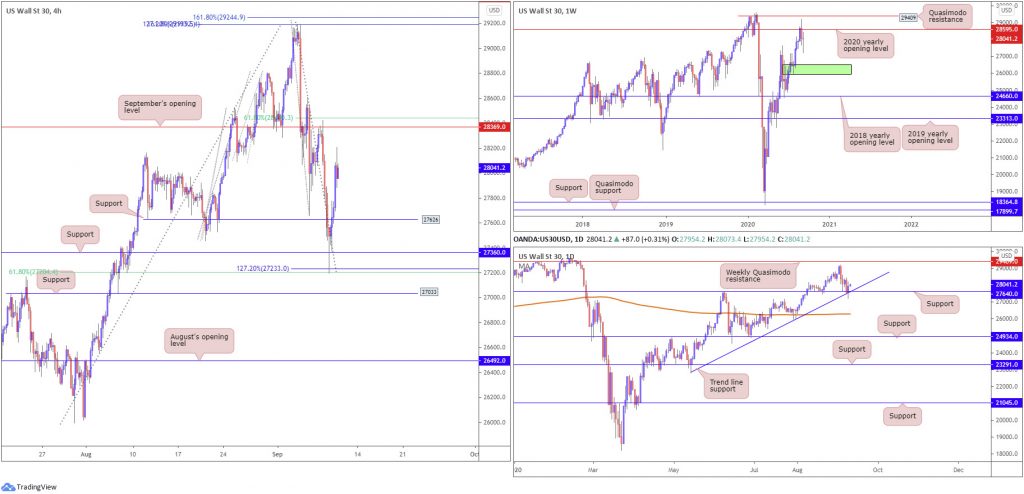 September’s opening level at 28369 on the H4 could be of interest today, having seen its connection with a 61.8% Fibonacci retracement ratio at 28440. Alternatively, a dip to H4 support at 27626 could be seen, given daily support is priced at 27640.