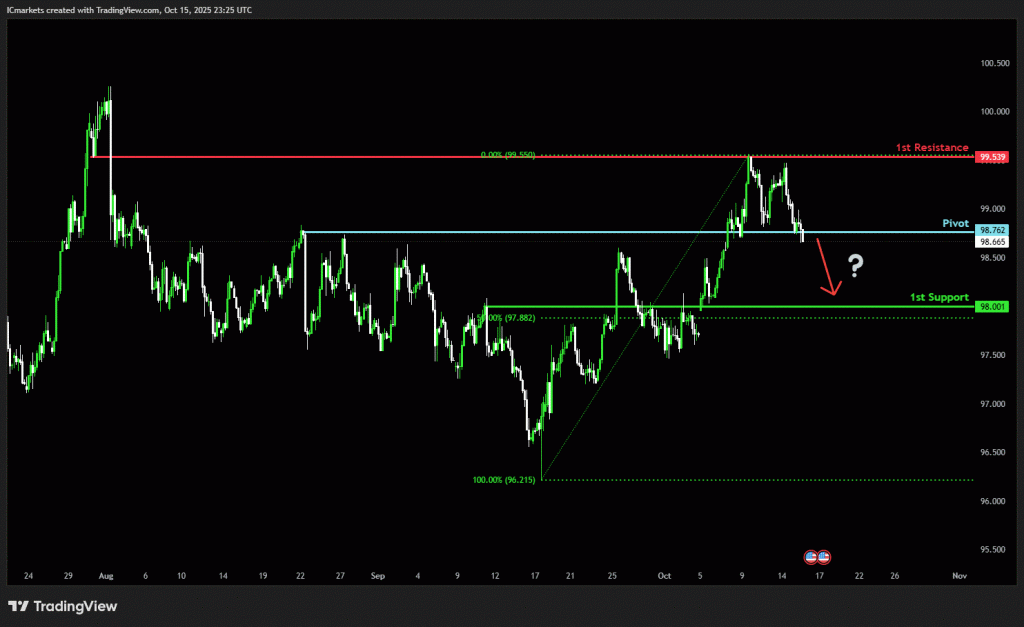 The price is currently showing downward momentum after failing to break above the 1st resistance at 99.53, suggesting more downside potential is likely in the short term.