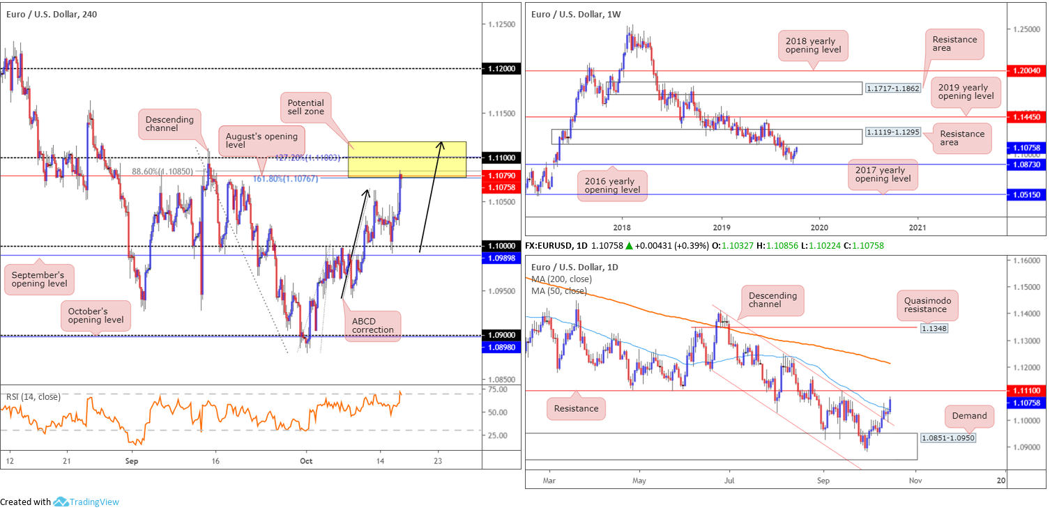 The 109 handle, given it holds notable confluence from the H4 and daily timeframes, is a barrier worthy of attention this morning. The only grumble, of course, is weekly price demonstrates scope to run beyond 109 to 109.68. To help overcome this and attempt to avoid an unnecessary loss, interested sellers from 109 are urged to consider waiting for additional H4 candlestick confirmation to form before pulling the trigger – think bearish engulfing or shooting star patterns, or even a full-bodied bearish candle. By doing so, not only does this identify seller intent, it also provides entry and risk levels to work with.