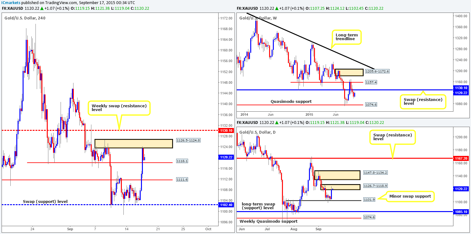 Following the sluggish response from the 4hr swap (support) level at 1102.4 on Tuesday, price continued to hesitate above this barrier during Asia trade yesterday. It was only once we saw European traders coming into the market did price launch itself north, taking out both 1111.6/1118.1 and stabbing into a 4hr supply at 1126.5-1124.8. The rebound from this 4hr supply was beautiful. This brought Gold back down to just above 1118.1, 4hr resistance – turned support.