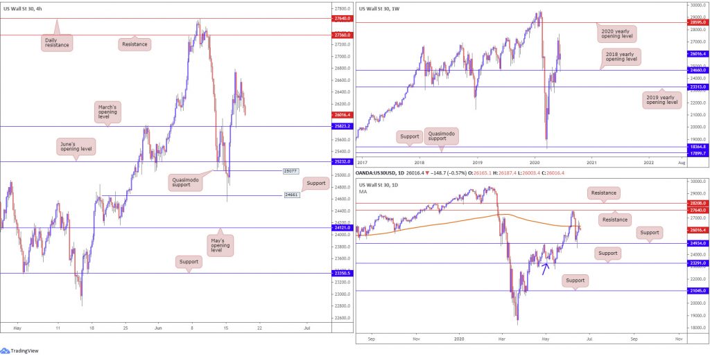 Against the backdrop of the higher timeframes, the H4 candles appear poised to knock on the door of March’s opening level at 25823, a level with an attractive history as support/resistance. Dropping under the aforementioned support today shifts crosshairs towards June’s opening level at 25232 and Quasimodo support at 25077 (located just above daily support at 24934).