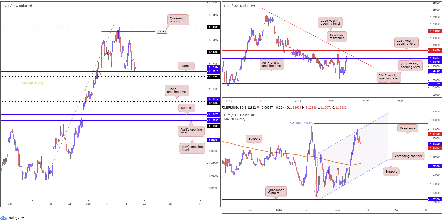 Technical studies based on the weekly timeframe have buyers and sellers battling for position at the 2020 yearly opening level from 1.1222. Upside, as you can see, is capped by long-standing trend line resistance, extended from the high 1.2555. A strong bid could override the aforementioned trend line resistance for the 2019 yearly opening level at 1.1445, while beneath 1.1222 we have the 2016 yearly opening level at 1.0873 noted as support. In view of the long-term trend, the pair has remained under pressure since topping in early February 2018.