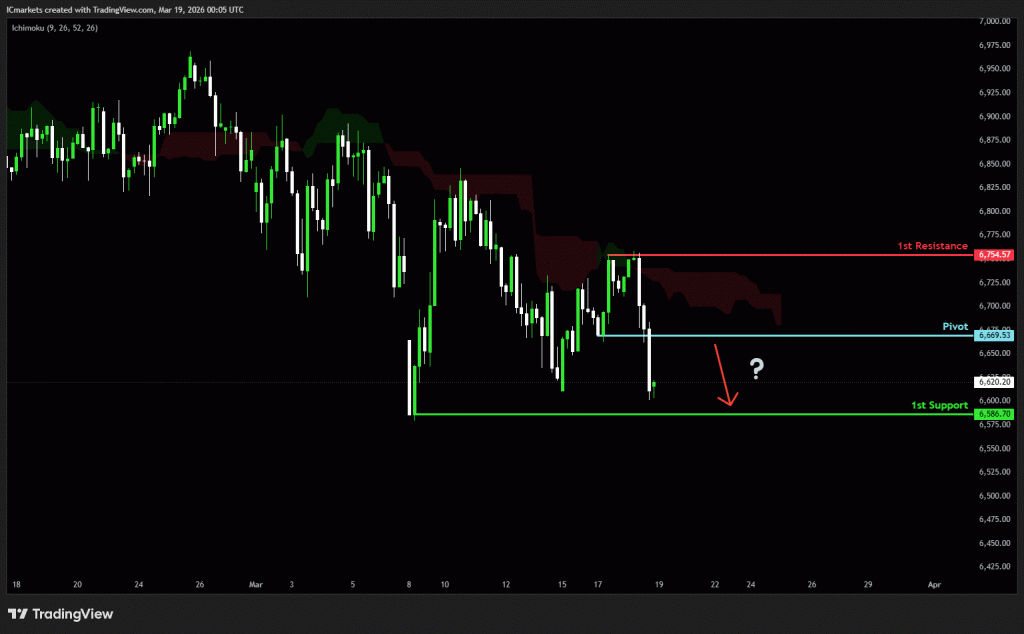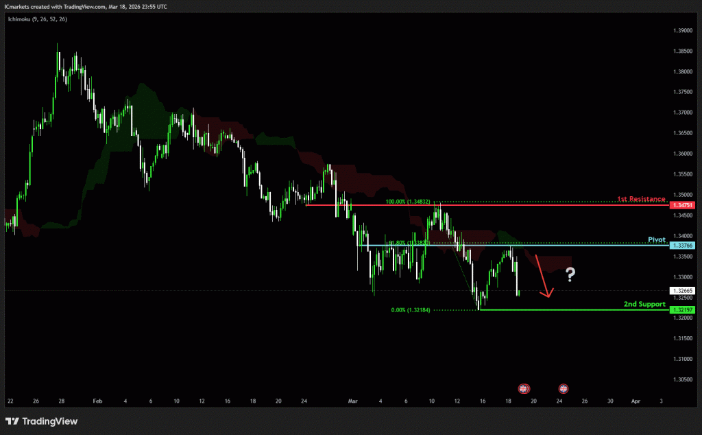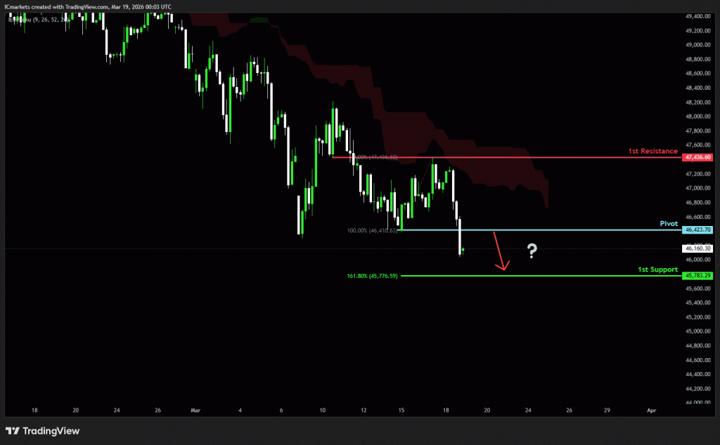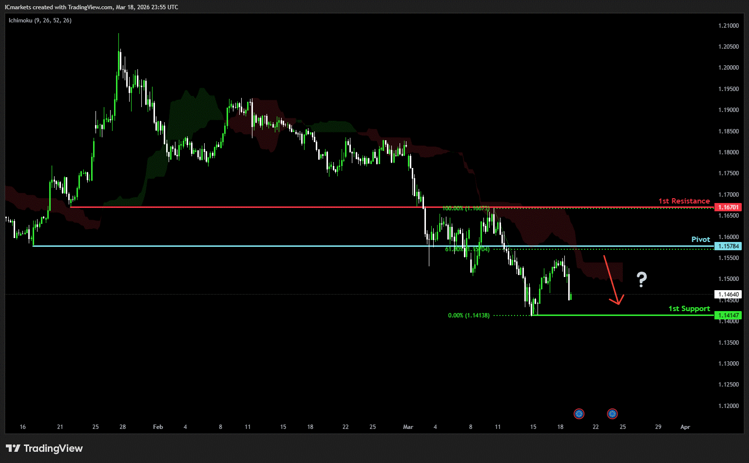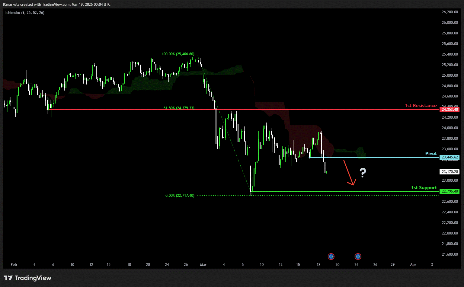 The price could see a short-term pullback toward the pivot before continuing its bearish move down toward the 1st support.