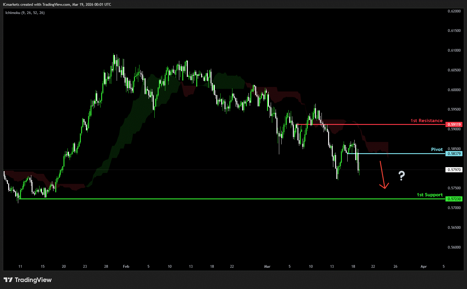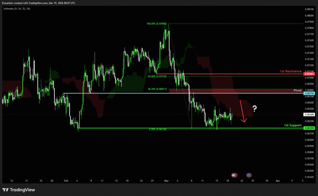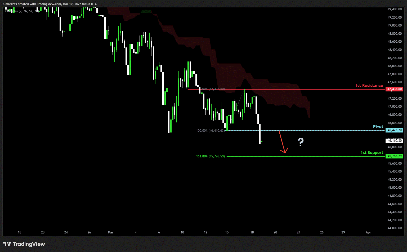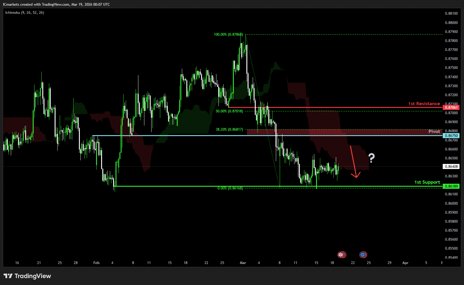 The price could see a short-term pullback toward the pivot before continuing its bearish move down toward the 1st support.