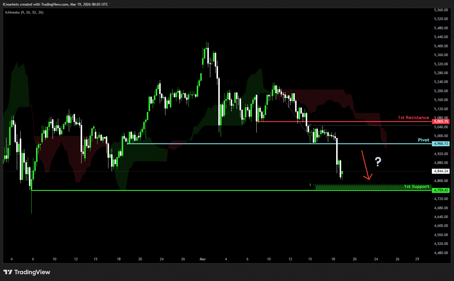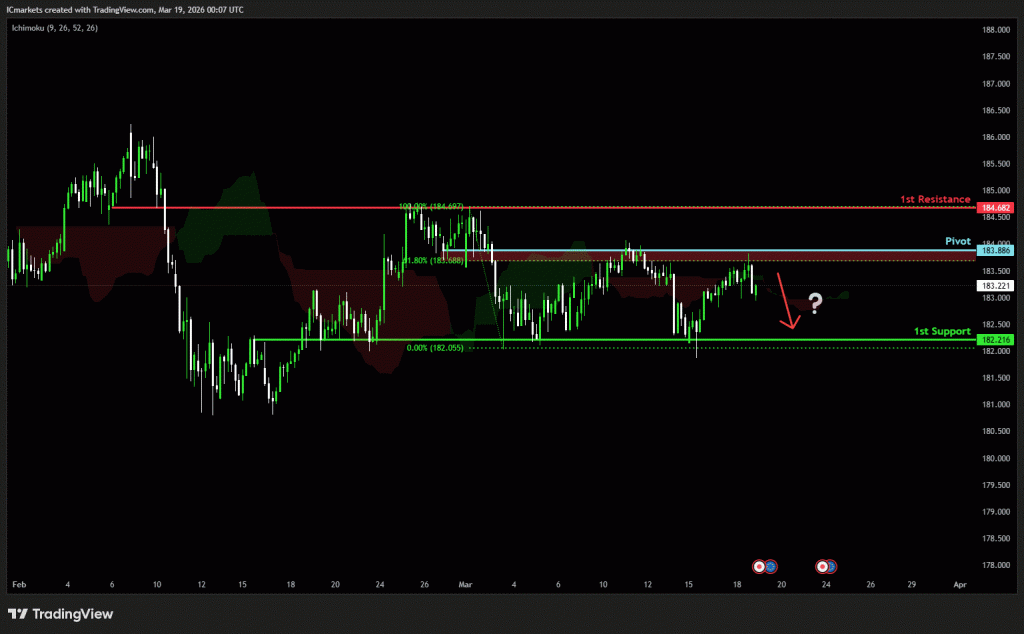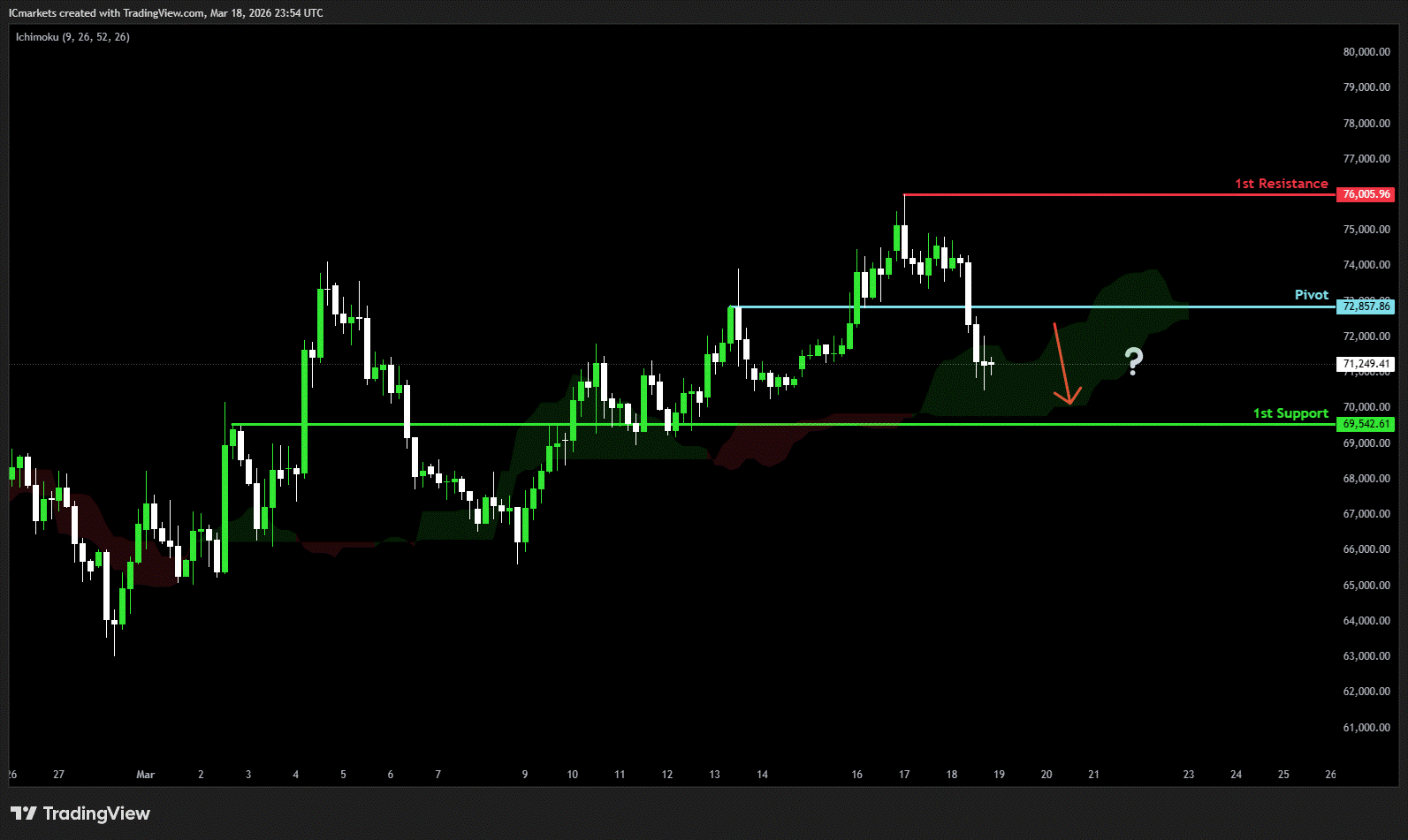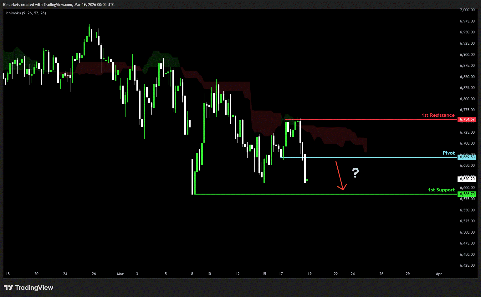 The price could see a short-term pullback toward the pivot before continuing its bearish move down toward the 1st support.