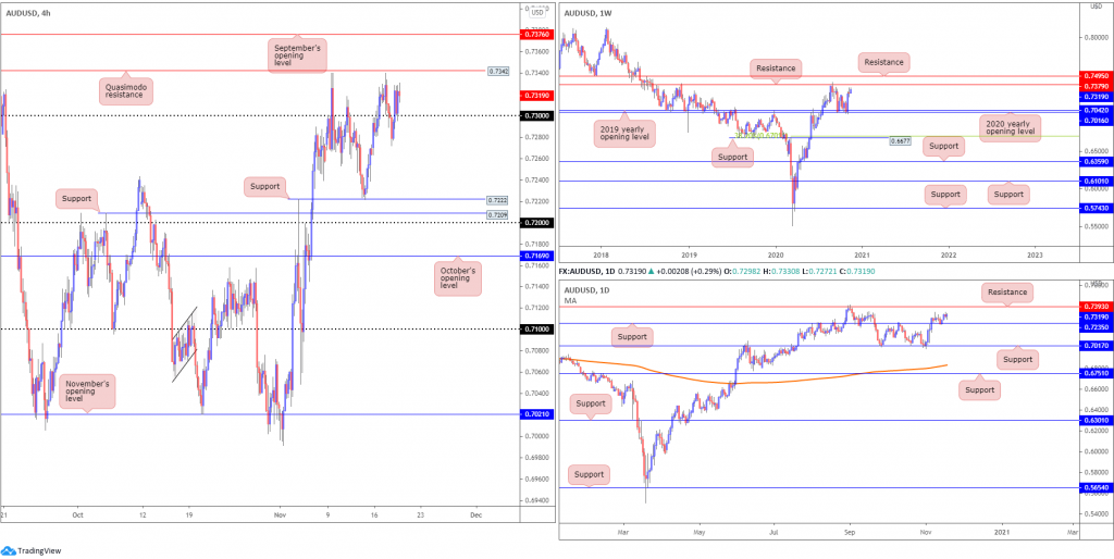 • The retest at 0.73 on the H4 has so far impressed buyers. Weekly and daily timeframes pointing to a push towards at least weekly resistance at 0.7379 could see buyers extend recent gains through H4 Quasimodo resistance at 0.7342 to September’s opening value at 0.7376 (connects with weekly resistance).