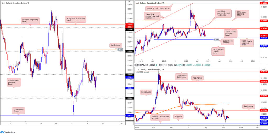 • A H4 close north of 1.31 may interest breakout buyers. Reinforced on the back of higher timeframe supports, buyers may look to lift the pair towards the 1.3172 November 13 high, followed by 1.32. Conservative traders may seek a 1.31 retest before pulling the trigger.