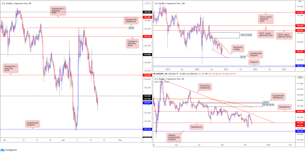 USD/JPY continued to navigate lower terrain Wednesday, chalking up a fifth consecutive daily bearish close. As evident from the H4 timeframe, bids took a hammering at 104 with price swiftly returning to the round number to collect any unfilled sell orders. With 104 representing resistance, moves to Quasimodo support at 103.21 will likely be eyed by sellers today.