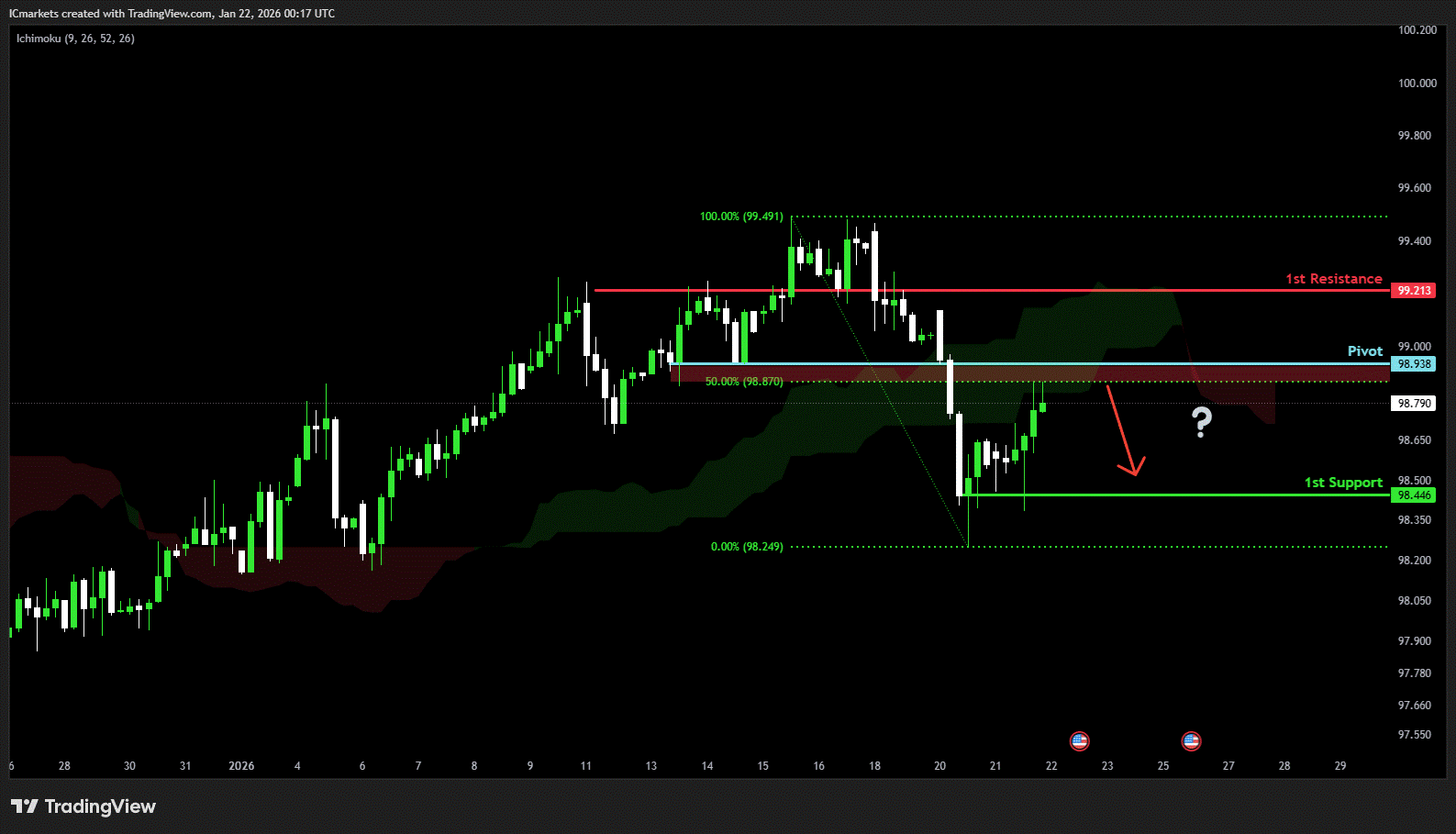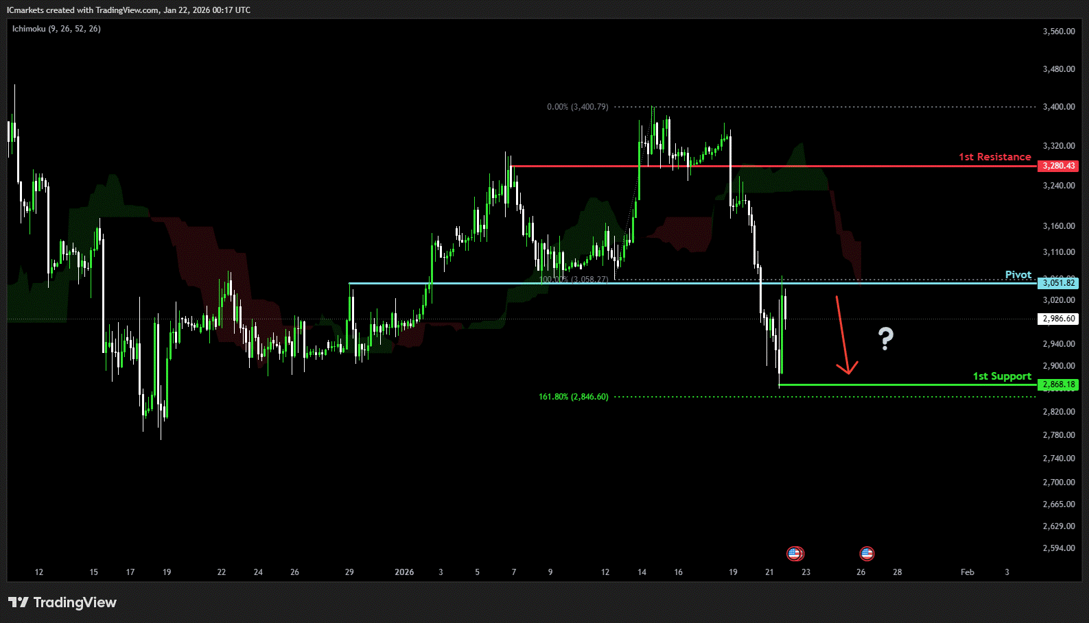 The price could see a short-term pullback toward the pivot before continuing its bearish move down toward the 1st support.