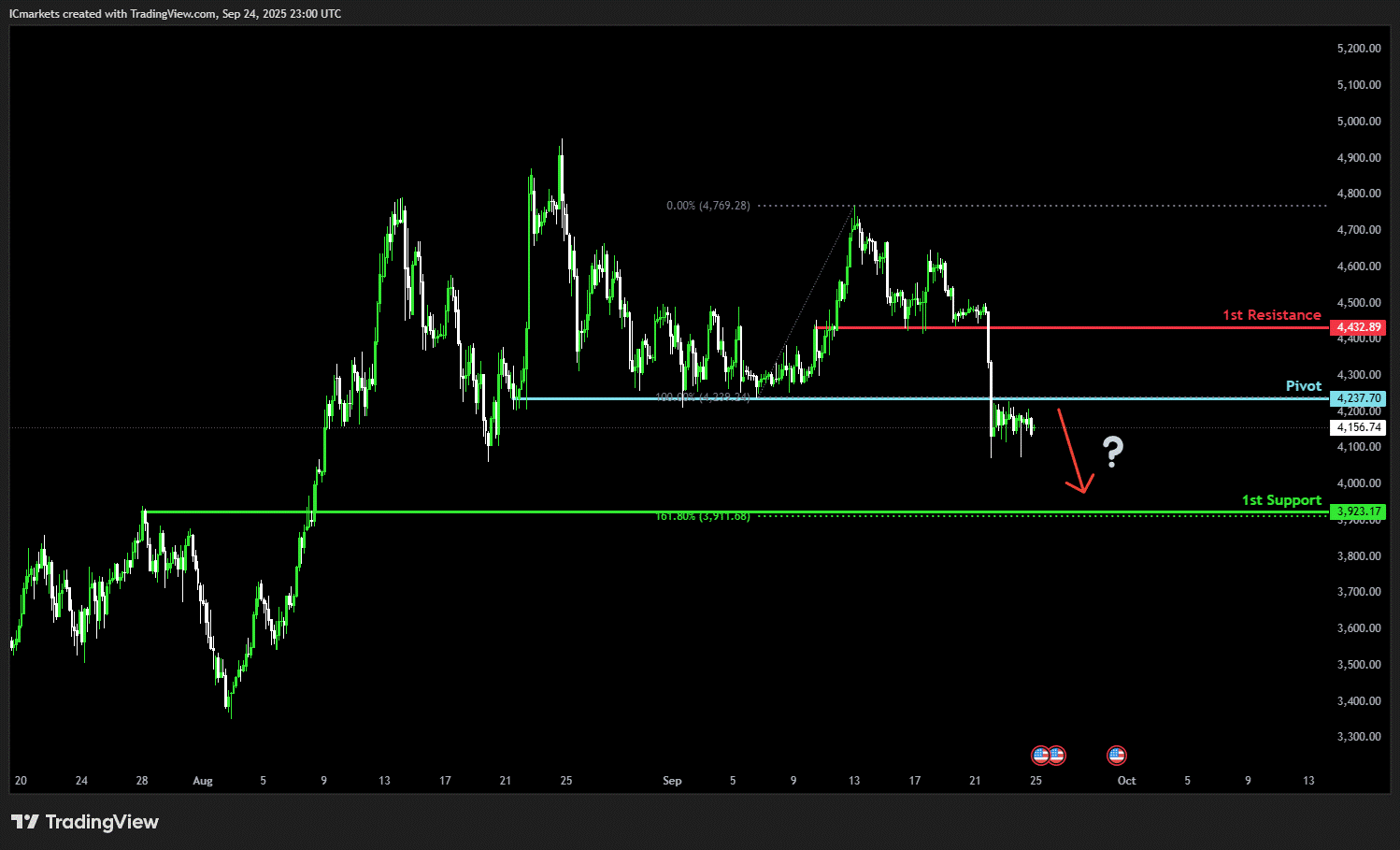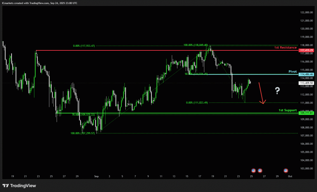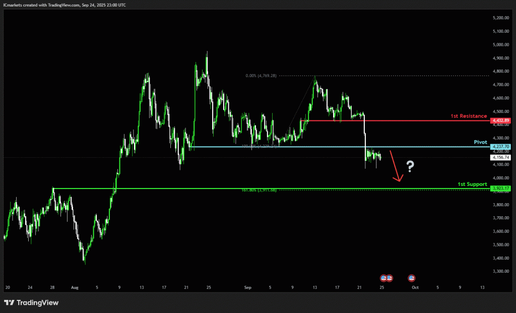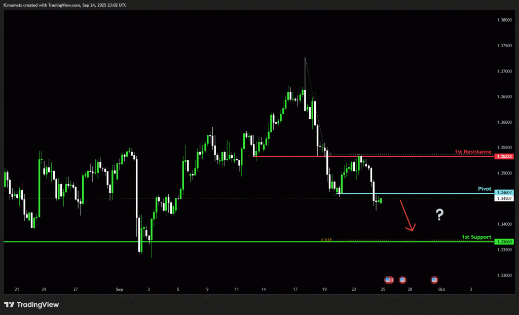 The price could see a short-term pullback toward the pivot before continuing its bearish move down toward the 1st support.