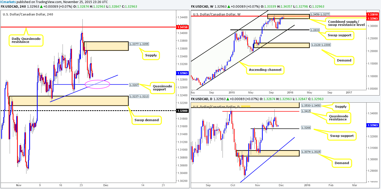 Not only does this barrier converge nicely with a trendline extended from the low 1.3224, it also coincides with a daily swap (support) level seen at 1.3266, thus likely providing a strong ‘floor’ in which to look to buy from. However, as solid as this buy zone sounds, we still have to take into consideration the fact that price is currently trading from a combined weekly supply/swap resistance area at 1.3456-1.3277/1.3381. This certainly does not mean that the H4 Quasimodo level will not hold if price reaches here, all it means is that we should only enter long from here with corresponding lower timeframe price action and be prudent with taking profits.