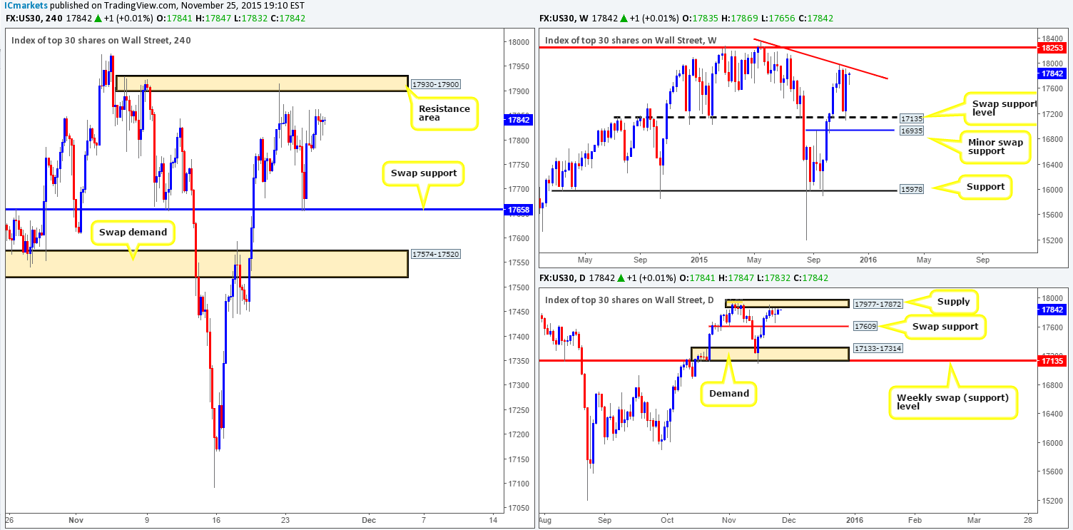 Given that price is currently trading mid-range between a resistance area drawn from 17930-17900 (positioned nicely around the weekly trendline barrier) and a swap support level seen at 17658, where do we go from here? Well, our team is still very interested in shorting from the current H4 resistance area today. However, we will not be placing a pending sell order here due to this zone being relatively small and thus prone to a possible fakeout.