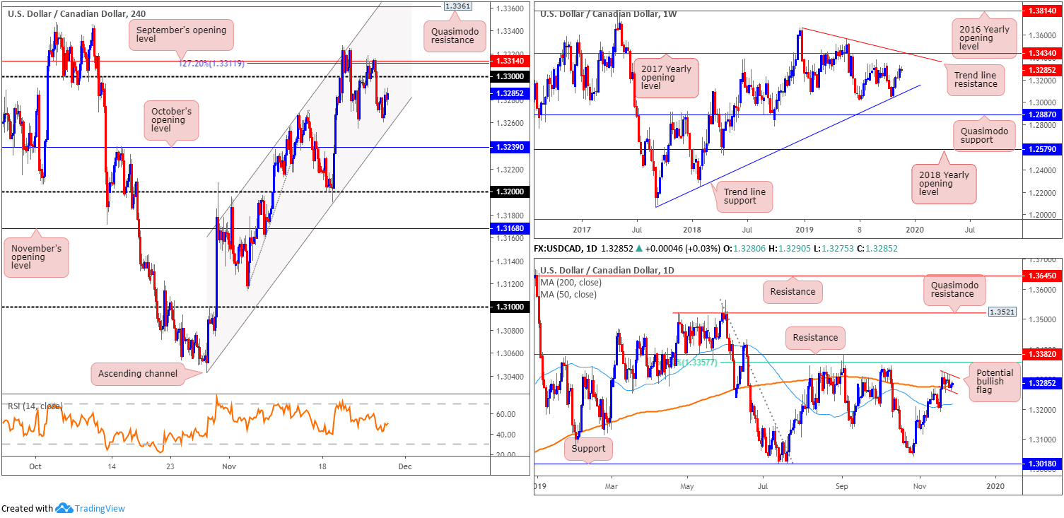 Medium-term flow based on H4 movement remains compressing within the confines of an ascending channel, taken from the low/high of 1.3042/1.3268. Upside resistance rests at the 1.33 handle, closely trailed by September’s opening level at 1.3314 and a 127.2% Fibonacci ext. point at 1.3311. Beneath the said channel support, support falls in around October’s opening level at 1.3239, followed by the 1.32 handle.