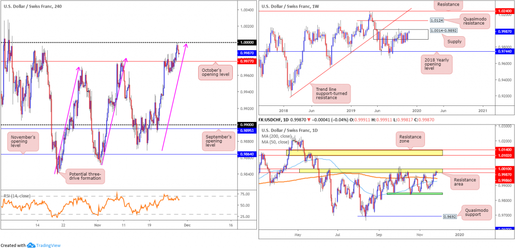 As evident from the daily timeframe, recent buying absorbed both the 50-day SMA (blue – 0.9925) and 200-day SMA (orange – 0.9947). Traders may also want to acknowledge that since mid-September, the unit has been busy carving out a consolidation between support around the 0.9845ish region (green) and a resistance area coming in at 1.0010/0.9986. Note price is seen toying with upper edge of the said range, as we write.