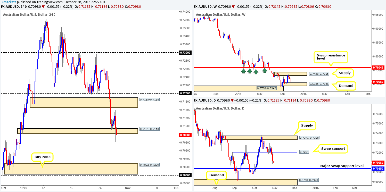 After the AUD/USD shook hands with demand at 0.7101-0.7113 at the beginning of yesterday’s trading day, a steady wave of buying was seen coming into this market, reaching highs of 0.7159 going into the American afternoon session. It was around this time, the FOMC meeting, did the Aussie take a turn for the worst. In one fell swoop, price dropped around 80 pips, stabbing below the above said demand and stretching to lows of 0.7080 by the day’s end.