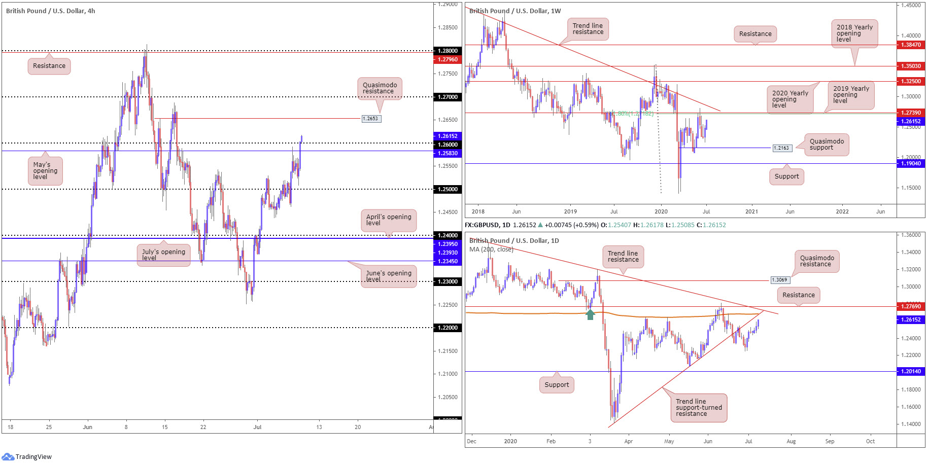The break of 1.26 will capture the attention of buyers on the H4 scale. This, alongside both weekly and daily timeframes suggesting territory north is clear until around the 1.27 handle (a point of robust resistance on the daily timeframe), will likely persuade breakout buyers to engage above 1.26 today, initially targeting H4 Quasimodo resistance at 1.2653, followed by 1.27.