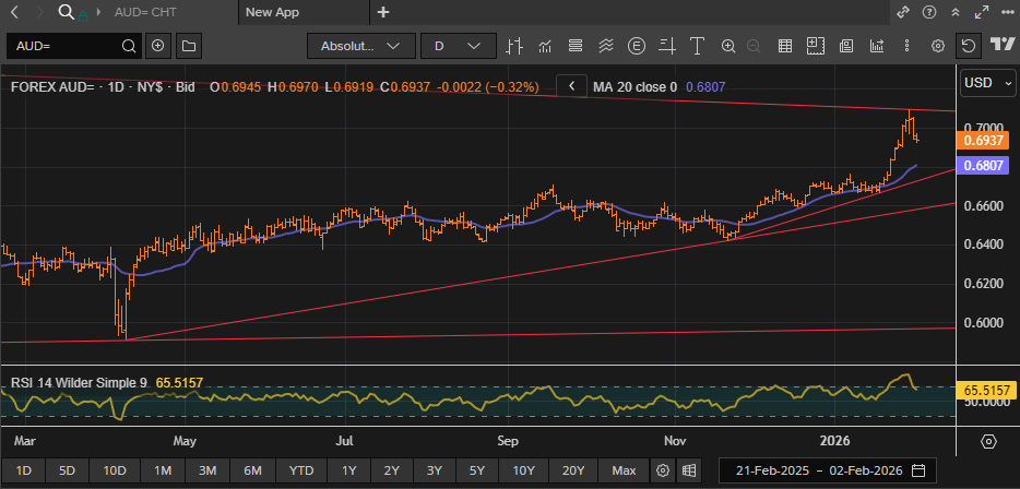 While markets have been absorbed with geopolitical factors and huge moves in precious metals over the last few days, underlying fundamentals will come back to the fore, at least for a short while, for Aussie dollar traders on Tuesday when the Reserve Bank of Australia makes its latest interest rate decision. The market is strongly pricing in the change (70%) of a 25-basis point rate cut as recent data has pointed to a strong economy. Continued inflation pressure with annual CPI up at 3.8% and a strong labour market that saw 65,000 new jobs added in December and the Unemployment Rate drop to 4.1% has seen those rate hike expectations increase and the Aussie dollar gain ground against the dollar and on the crosses.
