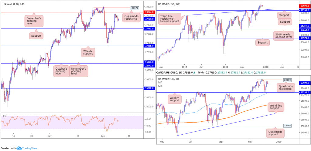 Recent selling came about ahead of December’s opening level at 28074, based on the H4 timeframe. This could result in the H4 candles revisiting support coming in at 27713, which, as you can see, has boasted reasonably significant history since the beginning of November. Beyond 28074, we have Quasimodo resistance in sight at 28172, while below 27713, weekly support may re-enter the fold at 27335.