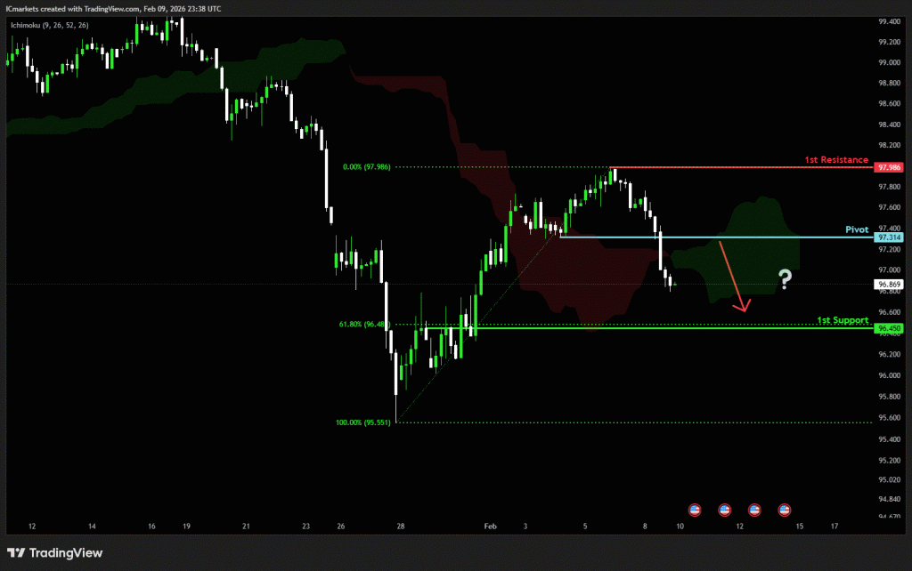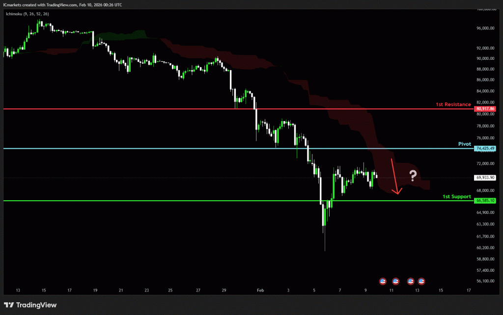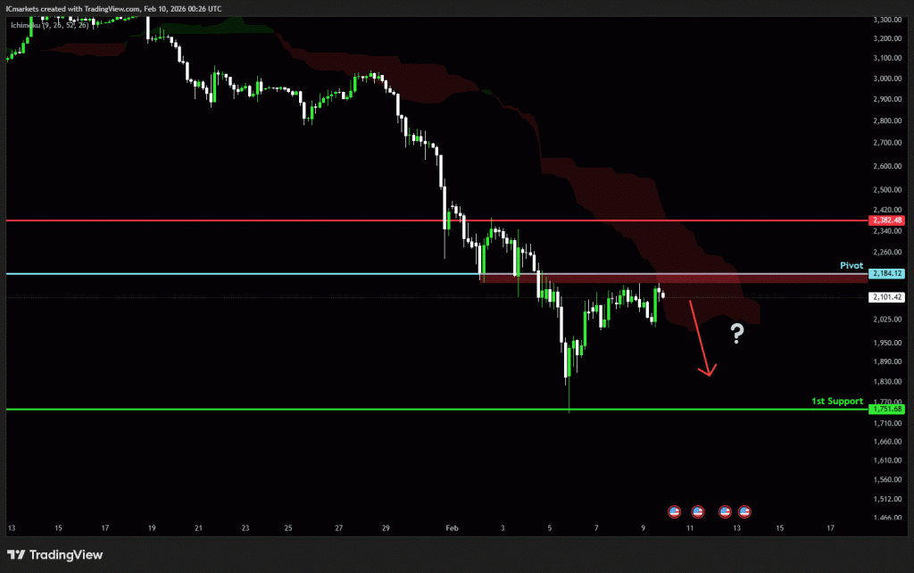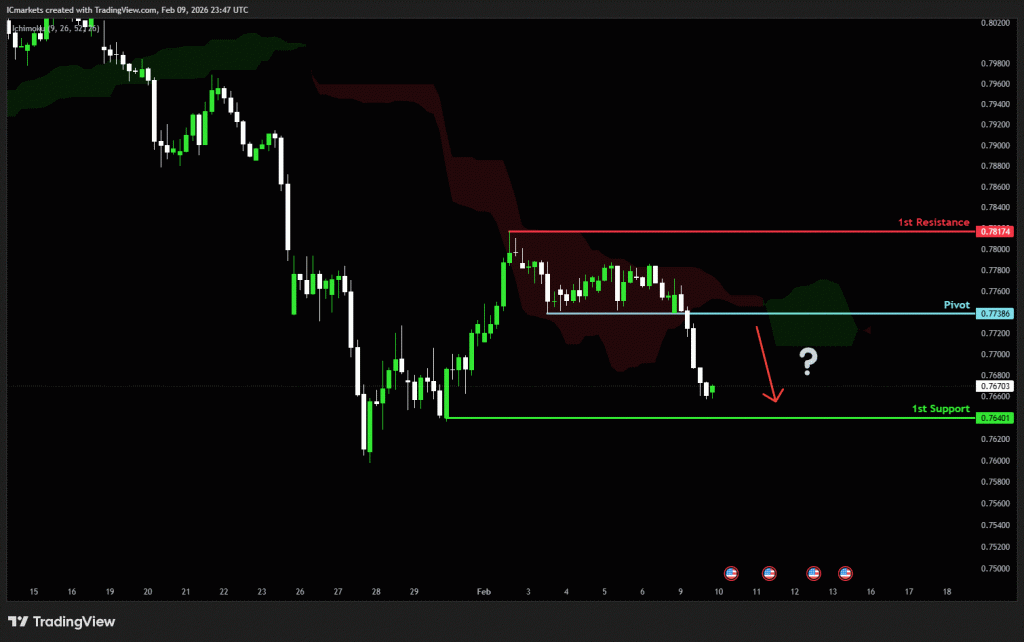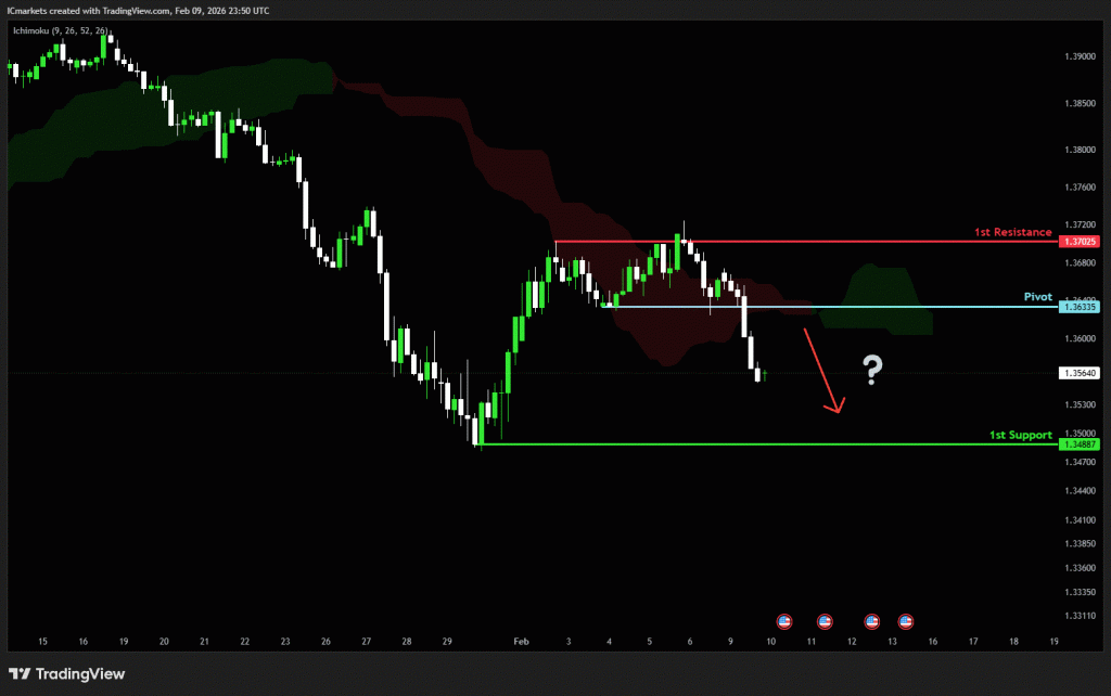 The price could see a short-term pullback toward the pivot before continuing its bearish move down toward the 1st support.
