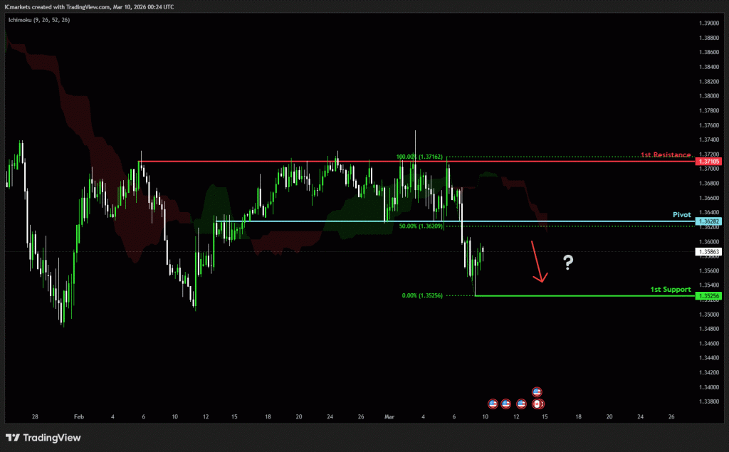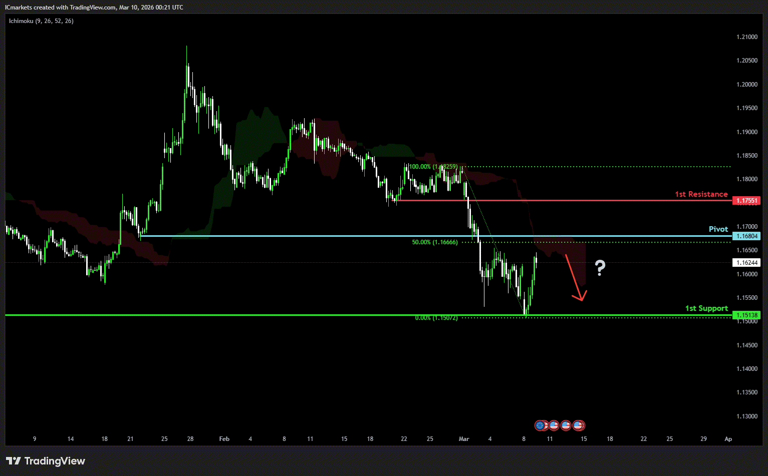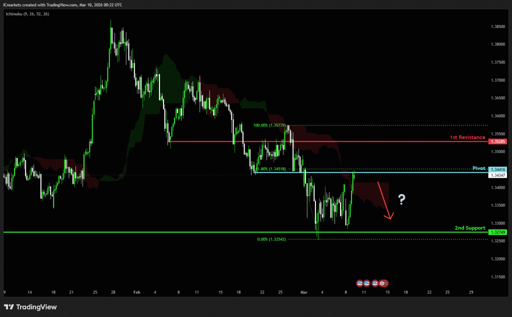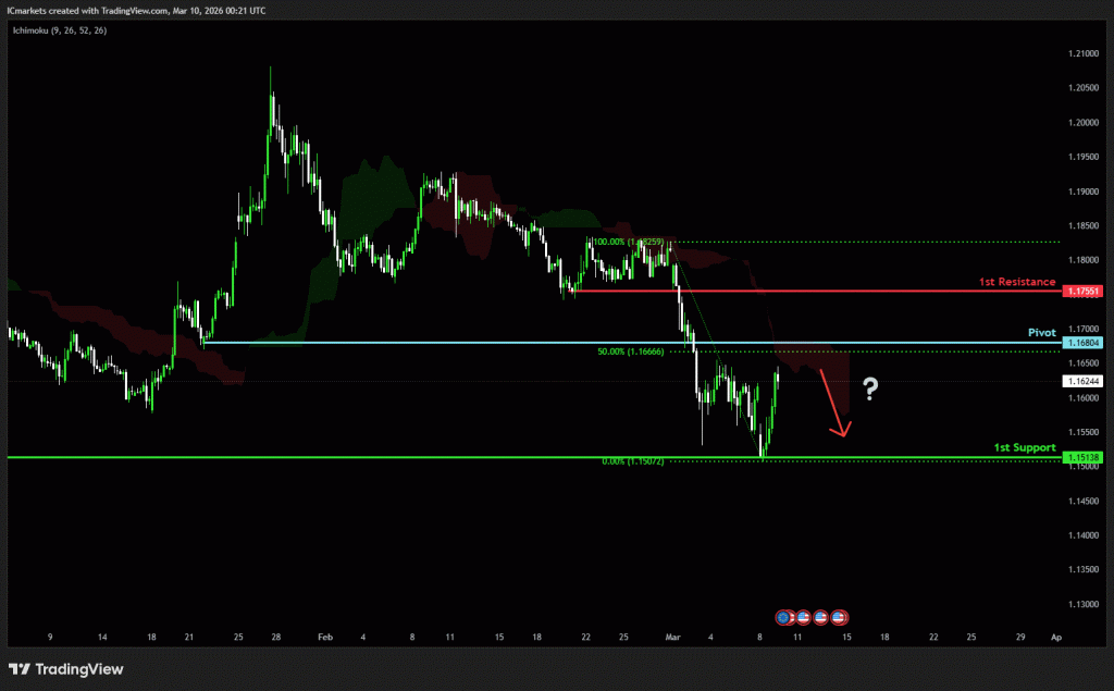 The price could see a short-term pullback toward the pivot before continuing its bearish move down toward the 1st support.