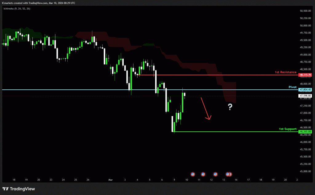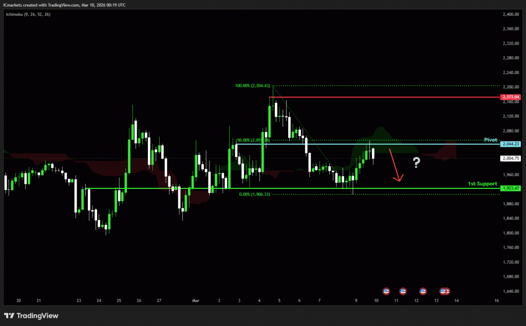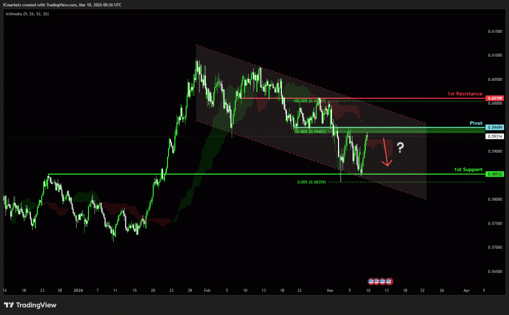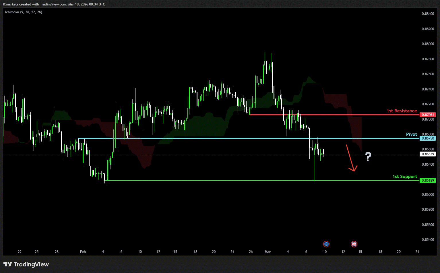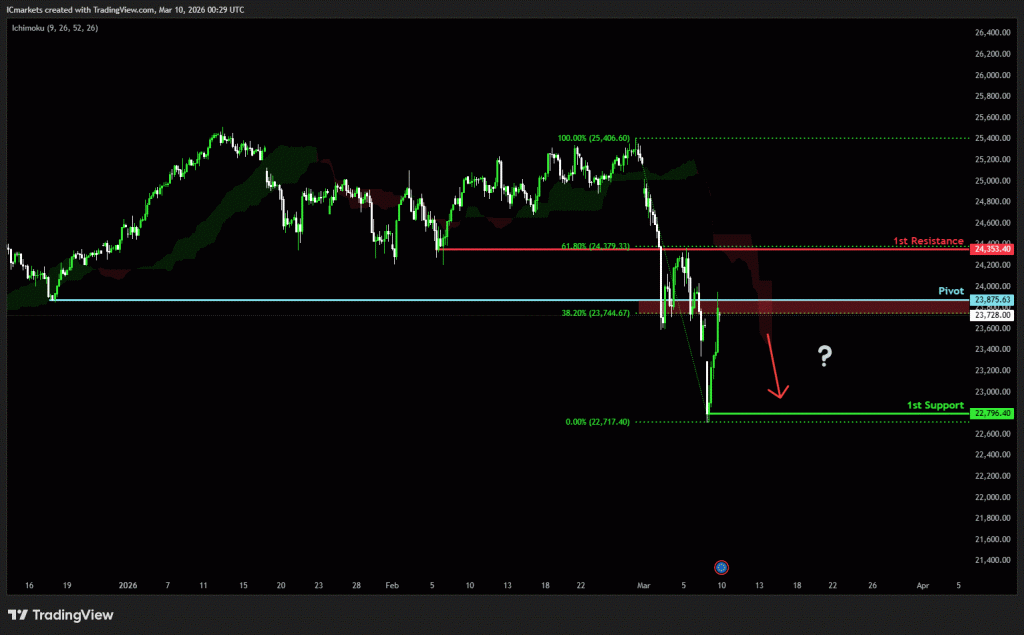 The price could see a short-term pullback toward the pivot before continuing its bearish move down toward the 1st support.