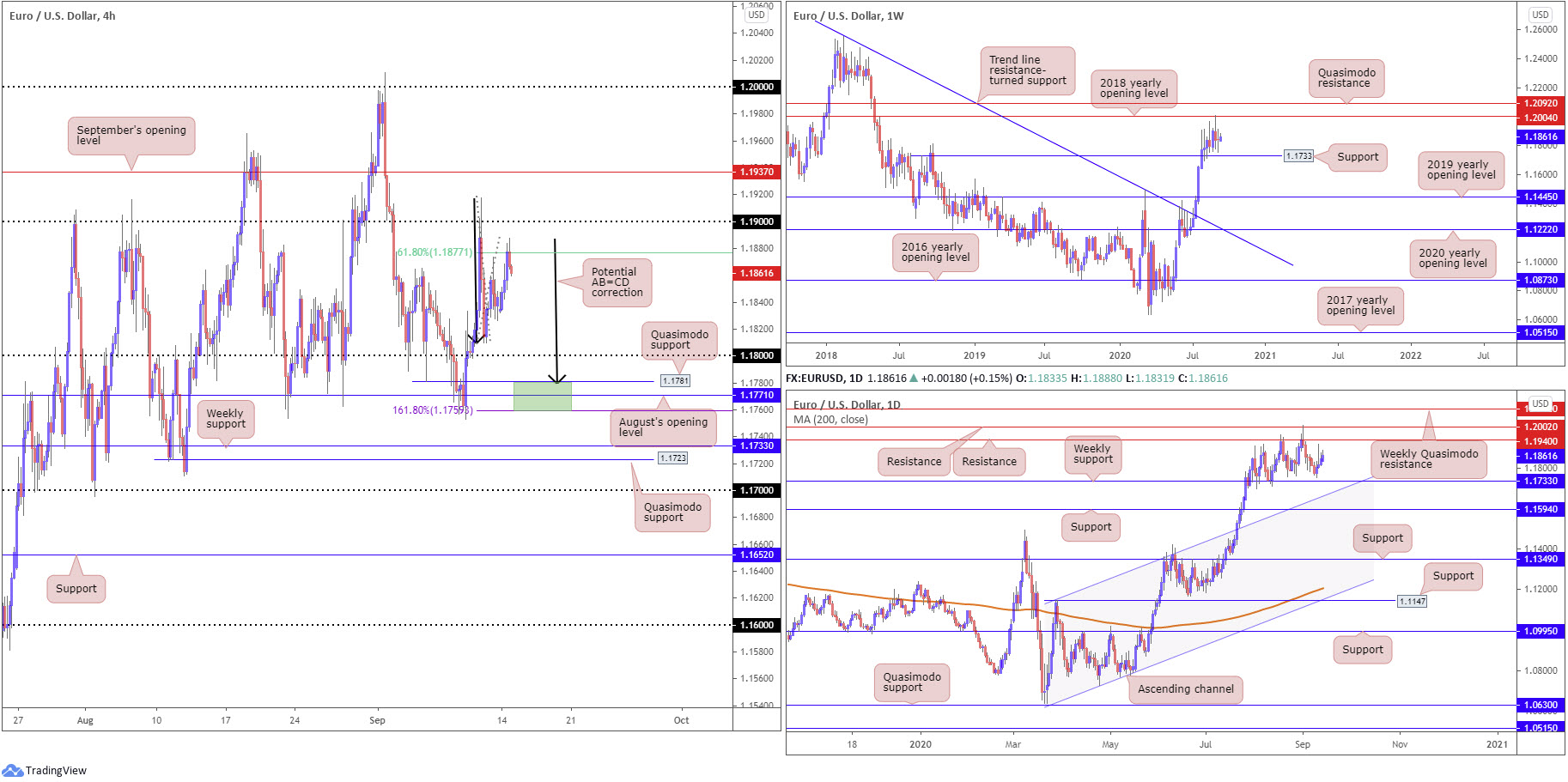 - The same can be seen above 1.19 on the H4. Piercing 1.19 and testing September’s opening level at 1.1937 (tripping buy-stop liquidity above the round number) may force a H4 close back under 1.19 and promote a bearish scenario. Note September’s opening level forms a close connection with daily resistance at 1.1940.