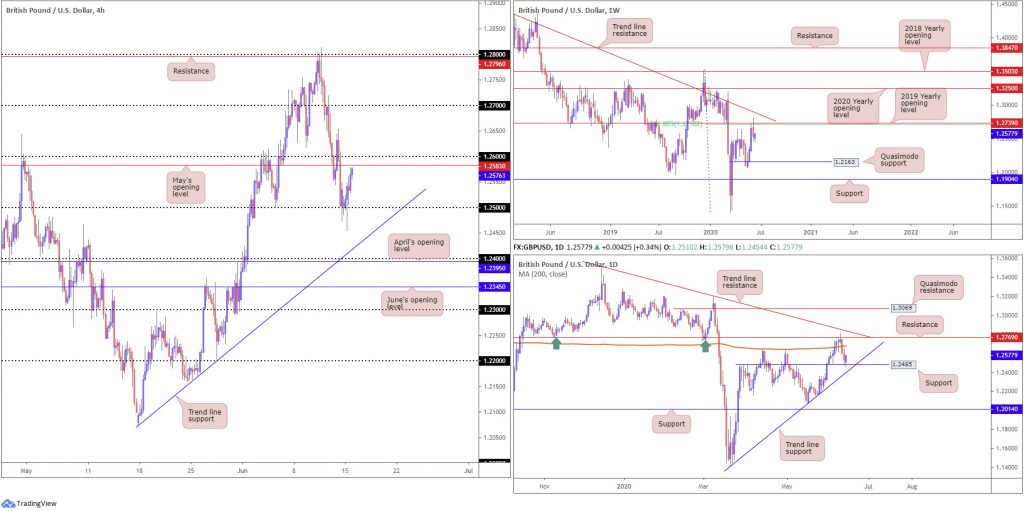 With H4 mildly surpassing 1.25, albeit holding by the close, and daily price bringing in daily support at 1.2485, a fakeout scenario (running stops under 1.25) likely occurred. This could generate additional buyer interest early week back to 1.26ish.