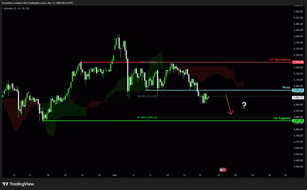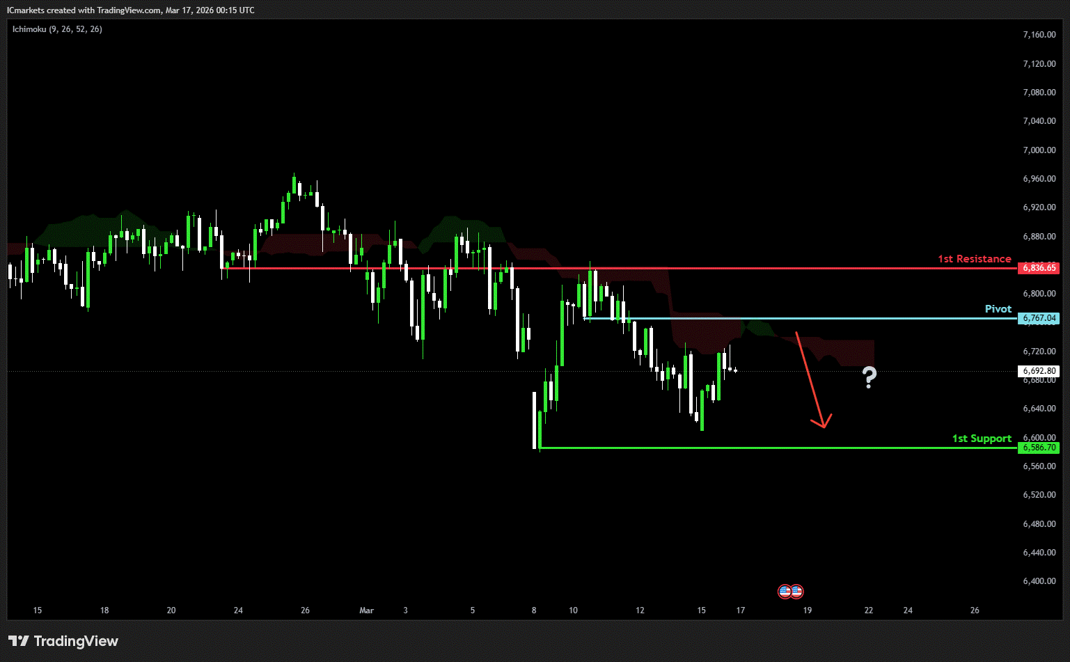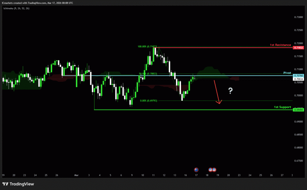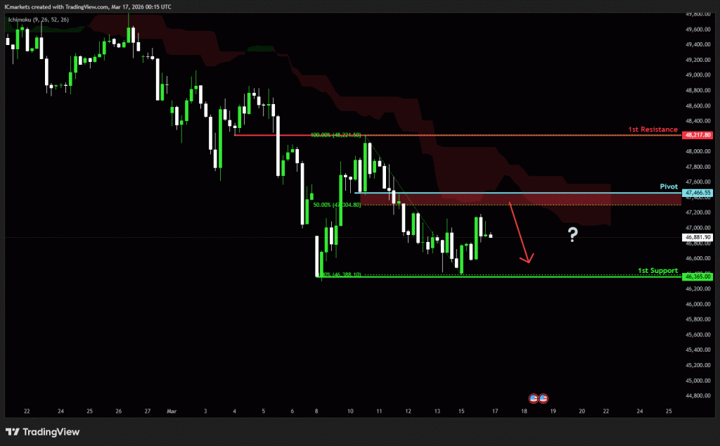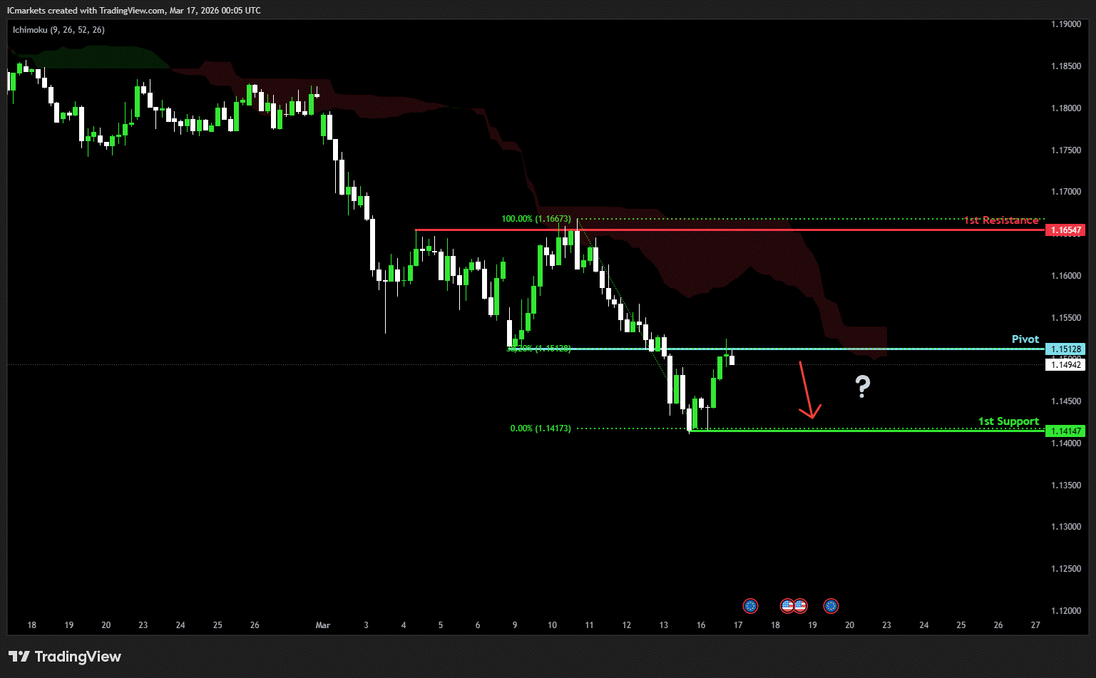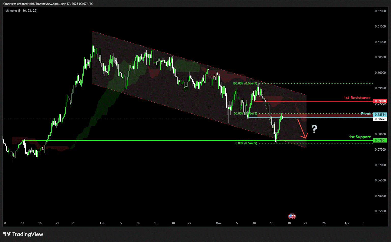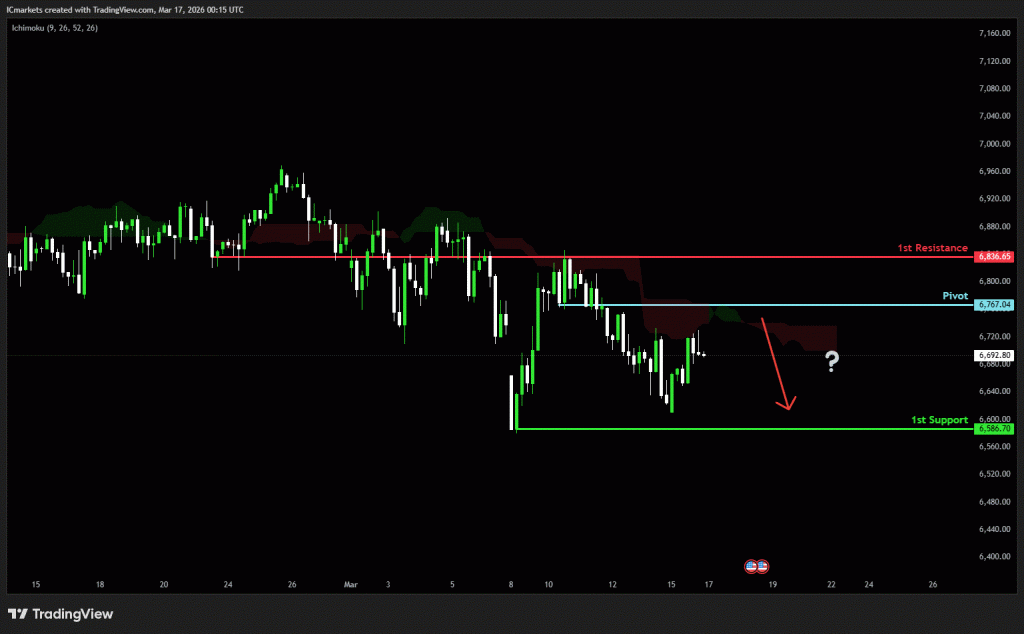 The price could see a short-term pullback toward the pivot before continuing its bearish move down toward the 1st support.