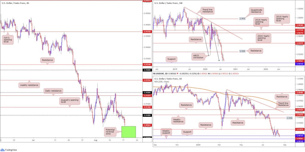 Leaving 0.91 unchallenged on the H4 timeframe and defeating daily support at 0.9072, the candles now trade within striking distance of an interesting area of support established between 0.90/0.9051 (green), formed by way of the 0.90 key figure on the H4 timeframe, weekly ABCD support at 0.9051 (black arrows) and weekly support coming in from 0.9014.