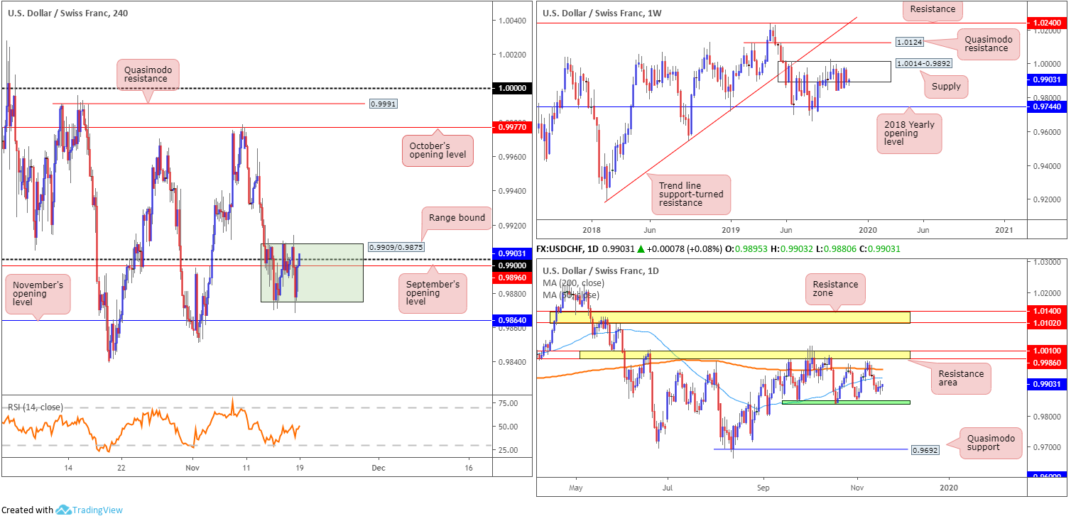 Since last week, H4 price has been pencilling in a consolidation between 0.9909/0.9875, which envelopes the 0.99 handle and September’s opening level at 0.9896. A few points south of this range lies an additional layer of support at 0.9864: November’s opening level, while a decisive break to the upside may unlock the door to October’s opening level coming in at 0.9977.