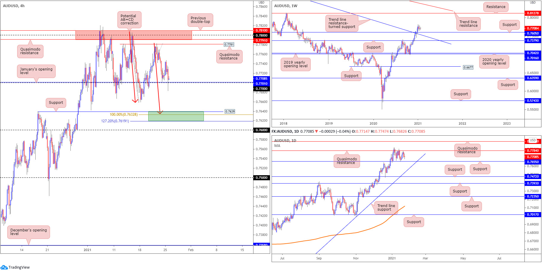 - January’s opening value at 0.7701 on the H4 and the 0.77 figure (an area now in play) has limited technical confluence, therefore could be fragile.