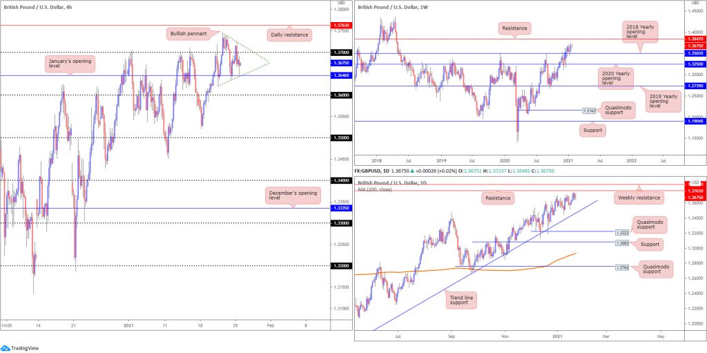 - Analysis suggests that a breakout above the H4 bullish pennant pattern could see price attempt to conquer daily resistance mentioned at 1.3763 and target weekly resistance at 1.3847.