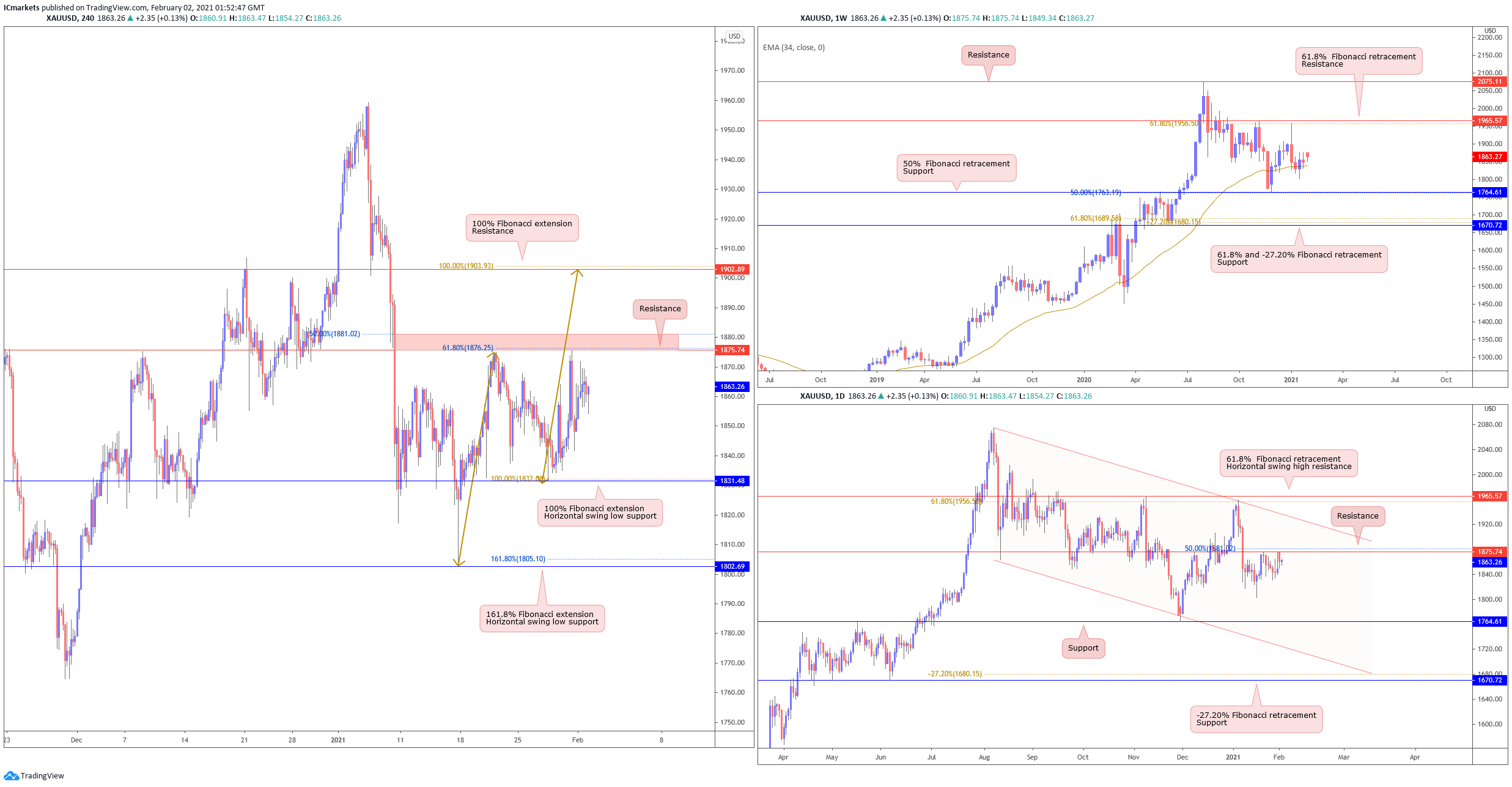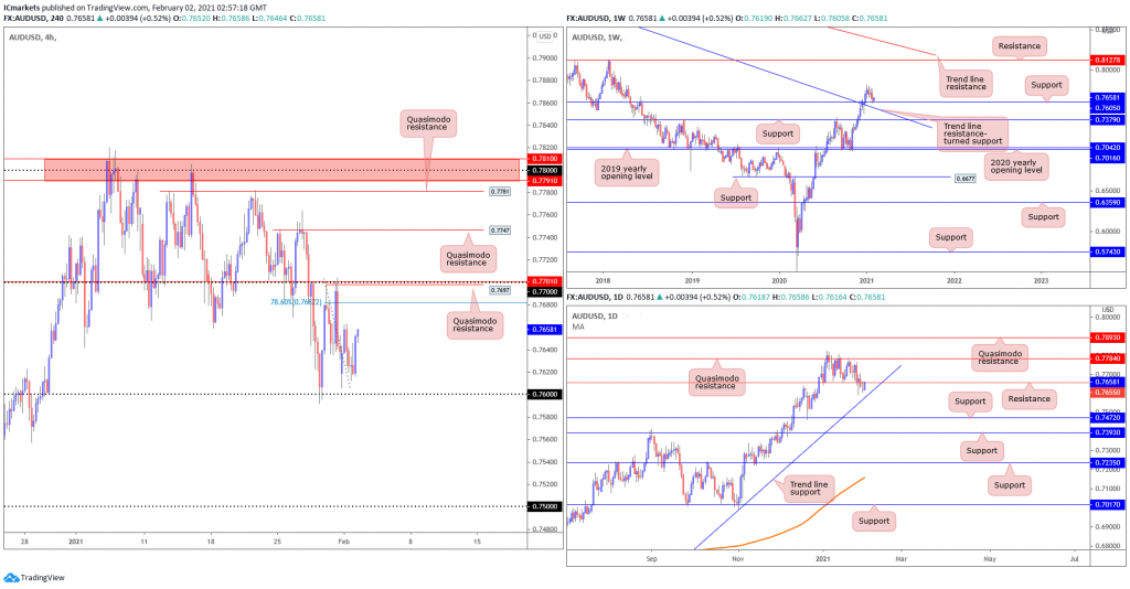 And on the H4 timeframe, price jumped higher near the 0.77 figure before H4 pencilled in a strong 100-pip pullback towards the downside. Along the January’s opening value at 0.7701, the 78.6% retracement ratio at 0.7862 and Quasimodo resistance at 0.7697 can be seen as the next port of call for the bearish move to the next support target of 0.76 level.
